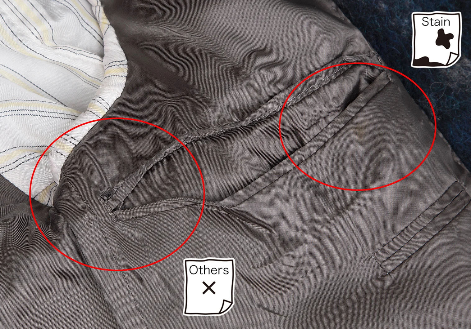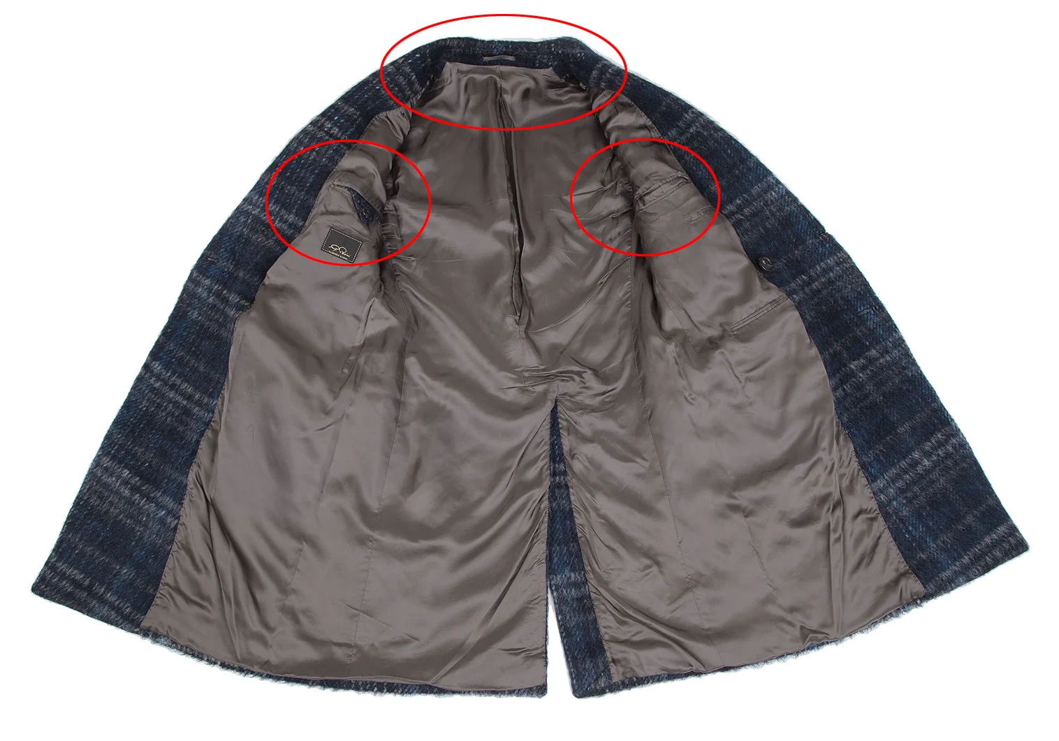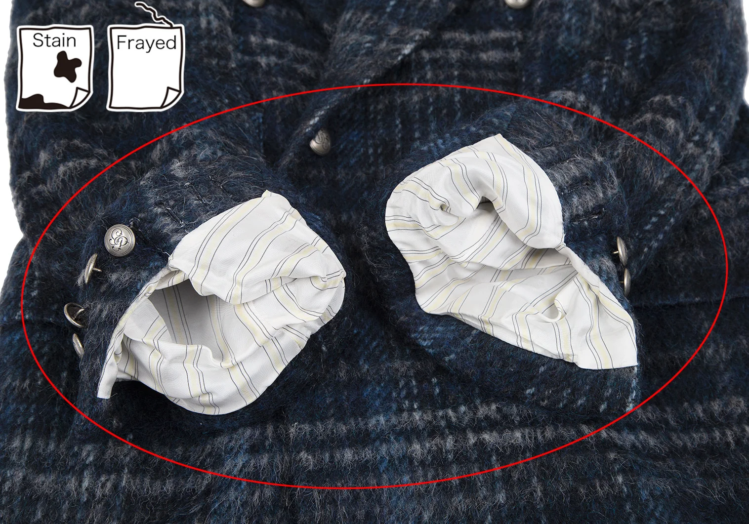 肩パッドがあります。袖裏に汚れ・糸引き、首元裏地縫い目に伸び、裏地左ポケットにシミ、裏地ポケット口にダメージがあります(写真参照)。その他目立ったシミ、汚れ、ほつれ等ない状態です。クリーニング済み