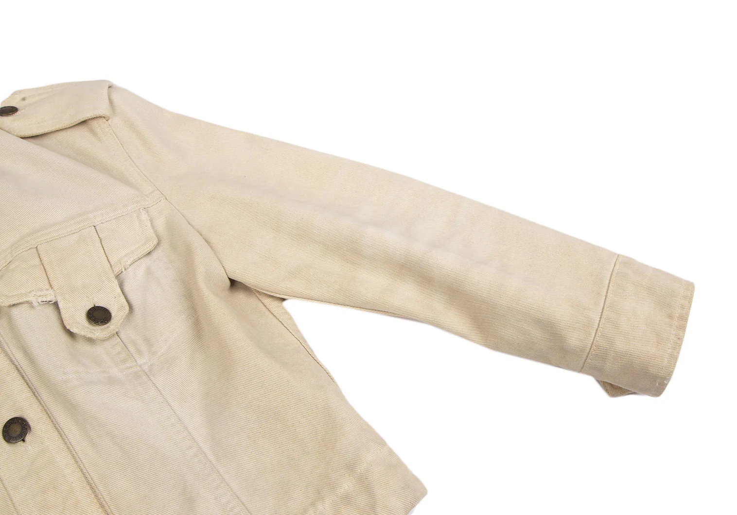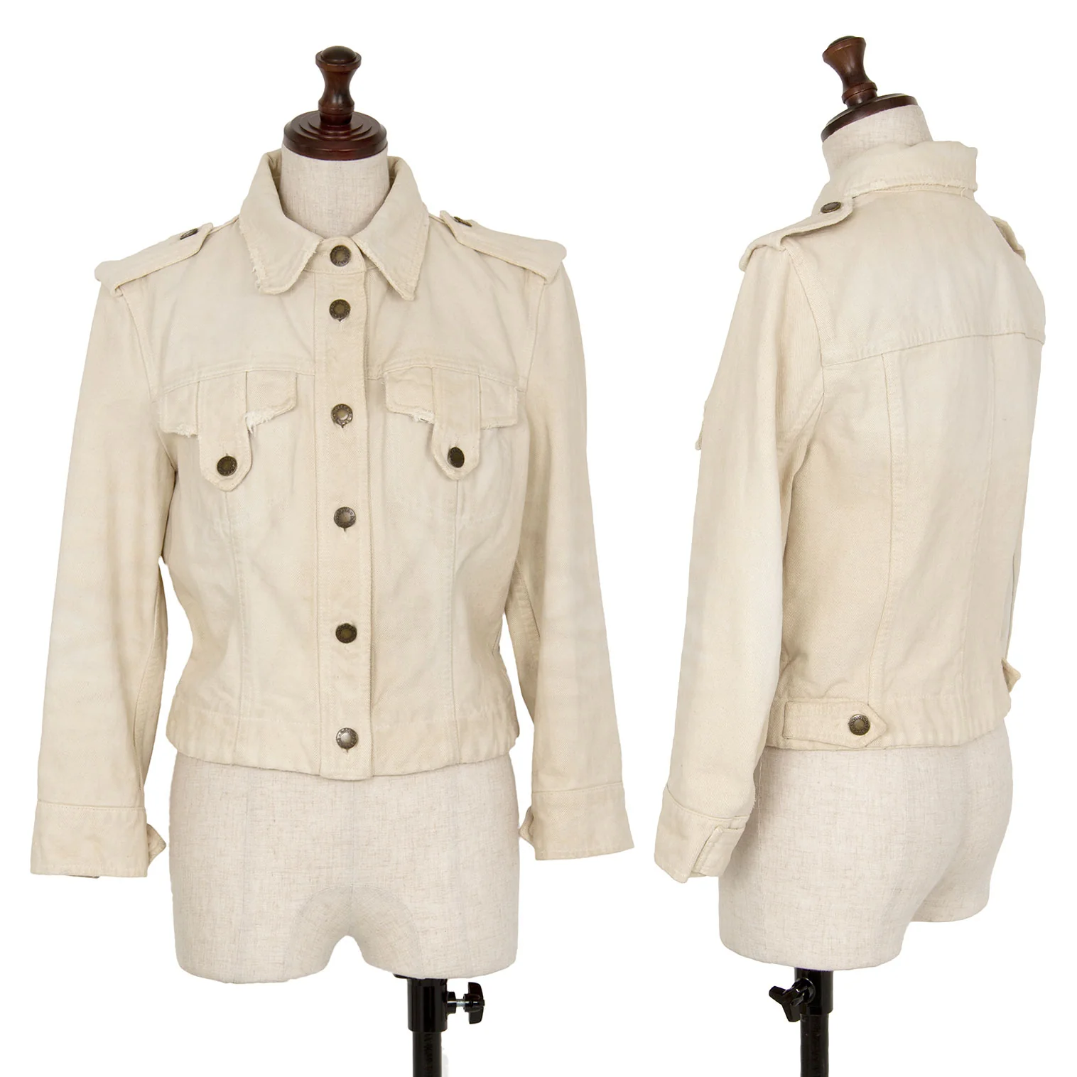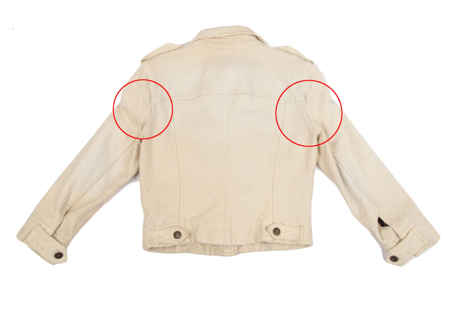 襟裏に汚れ・変色、前に点シミ、袖先ステッチにほつれ、後ろ袖付け根の縫い目に緩みがあります(写真参照)。その他目立ったシミ、汚れ、ほつれ等はありません。クリーニング済み
