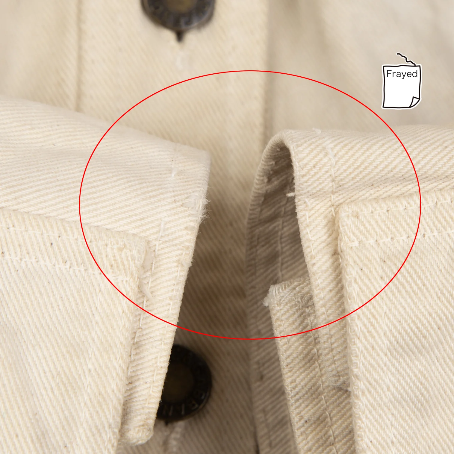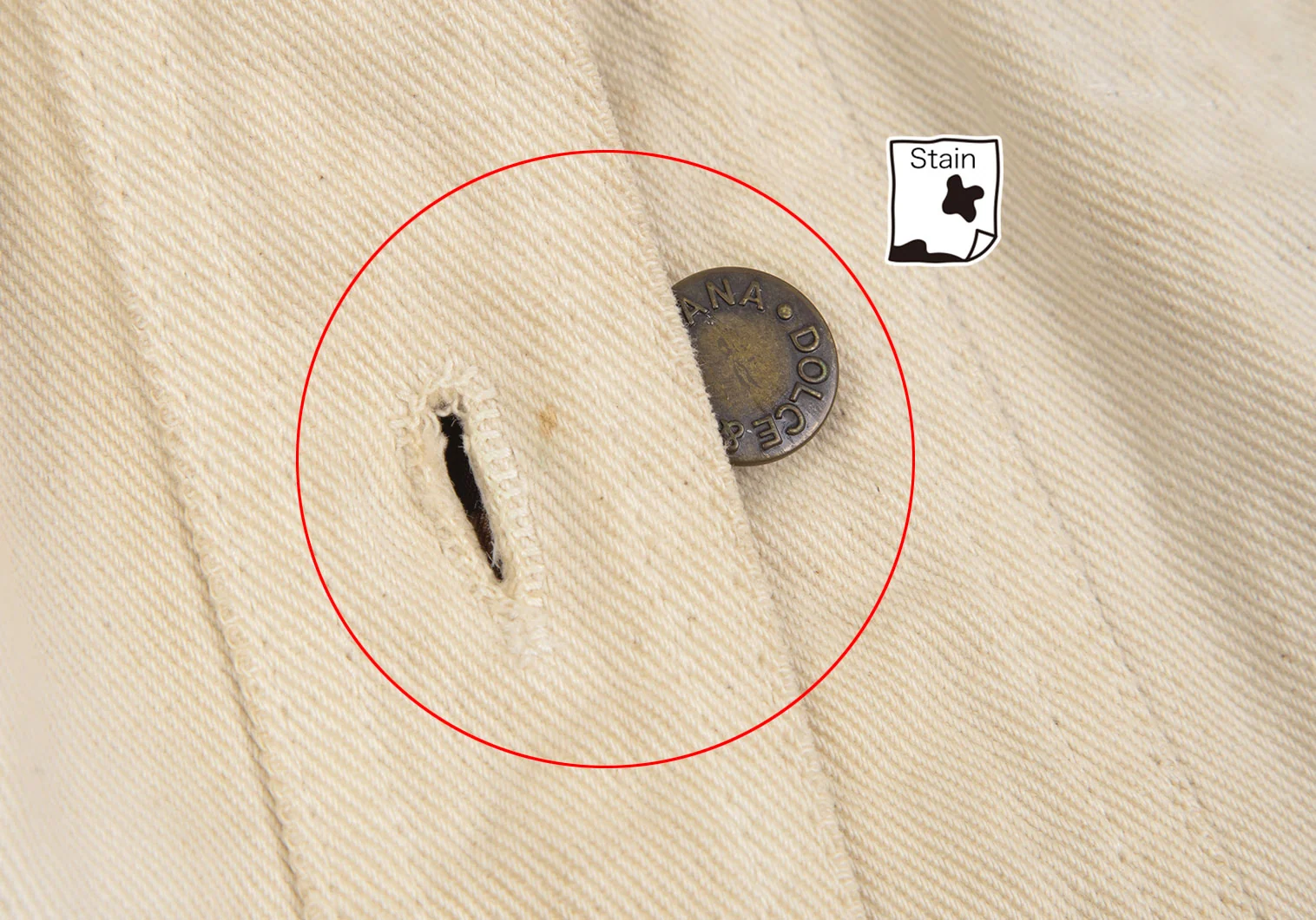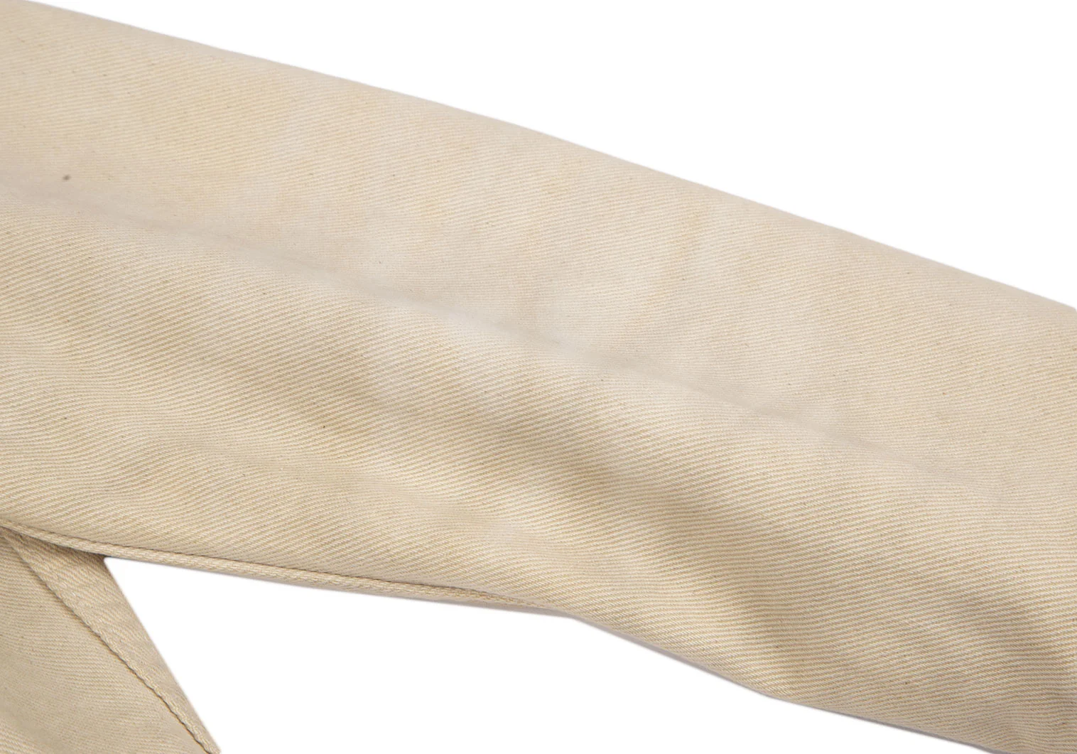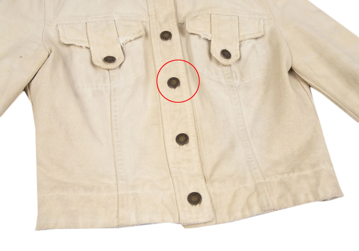 襟裏に汚れ・変色、前に点シミ、袖先ステッチにほつれ、後ろ袖付け根の縫い目に緩みがあります(写真参照)。その他目立ったシミ、汚れ、ほつれ等はありません。クリーニング済み