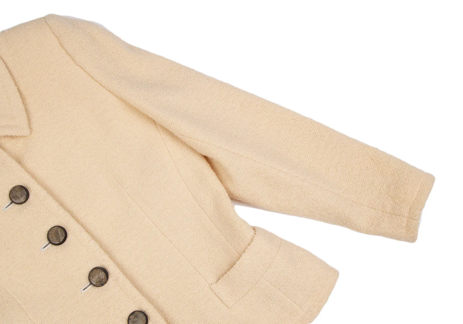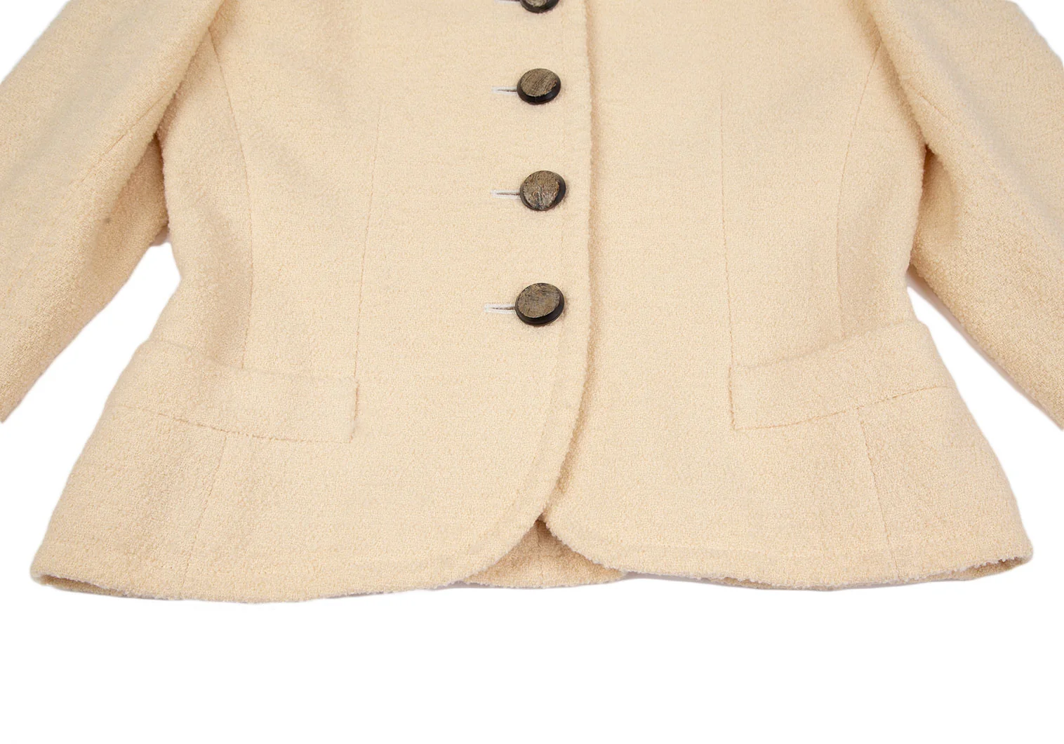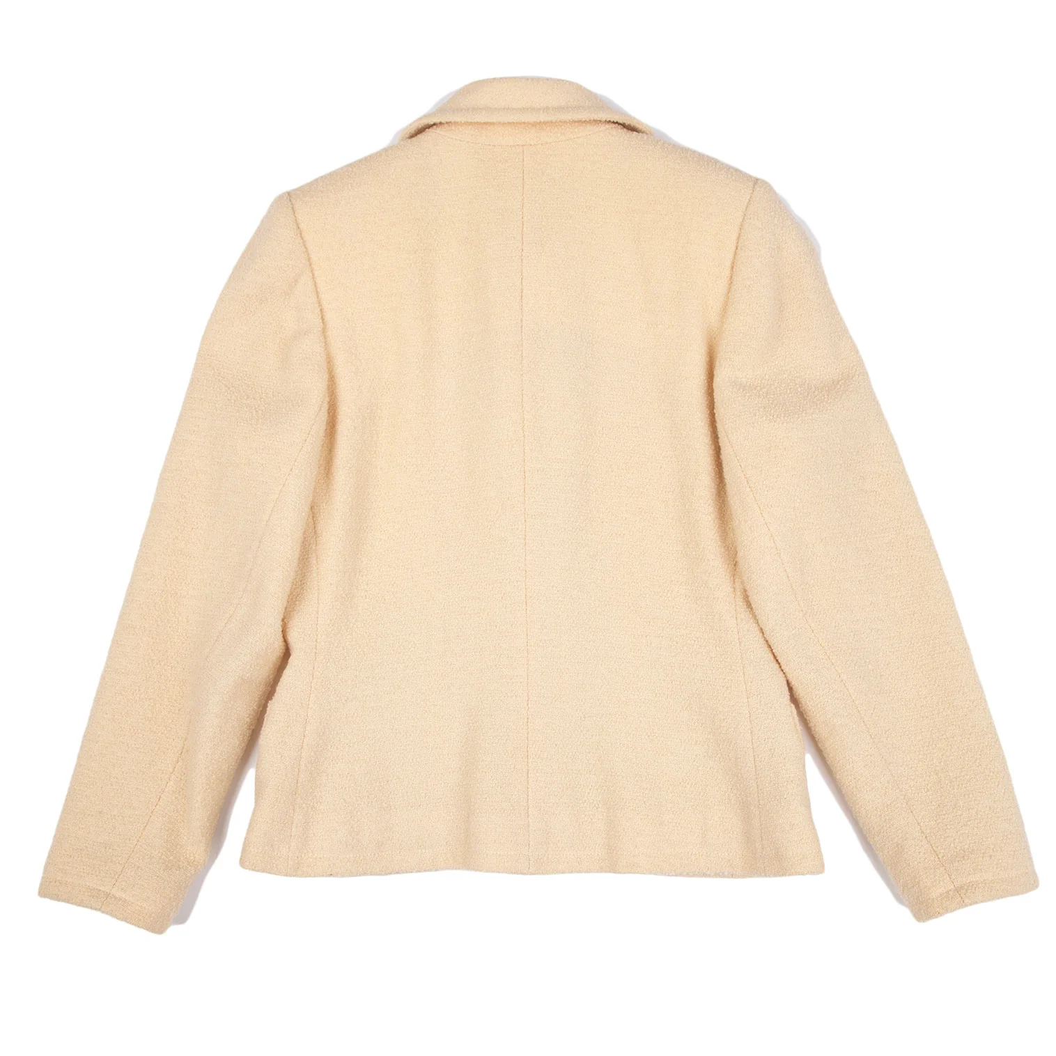 肩パッドあり。袖裏・裏脇下にシミ、裏地首元に薄汚れがあります(写真参照)。その他目立ったシミ、汚れ、ほつれ等はありません。クリーニング済み