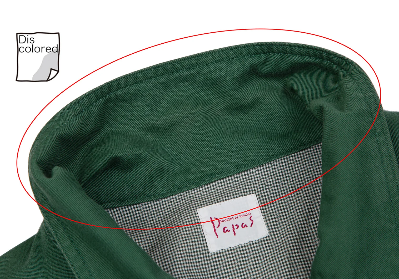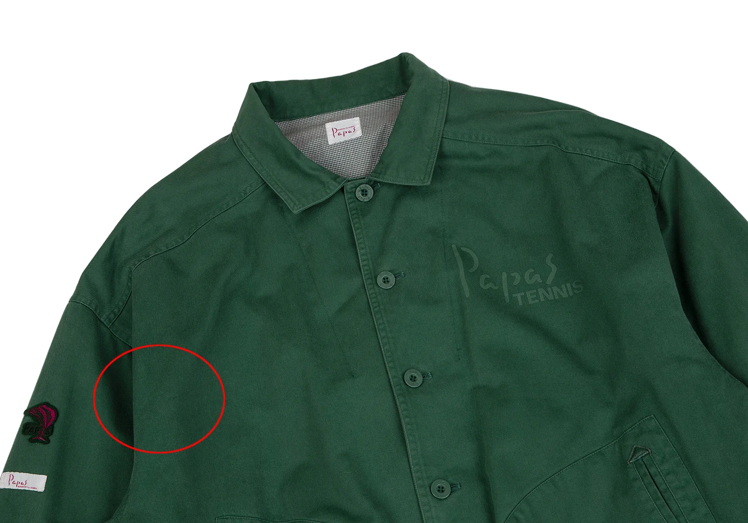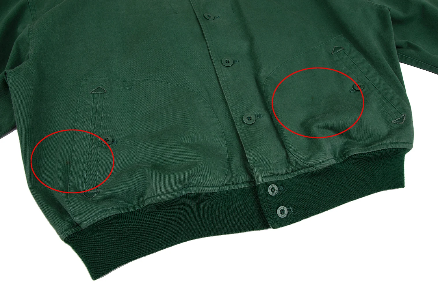 首裏・袖先など全体に色褪せがあります。前右脇・袖裏・前裾・袖にシミがあります(写真参照)。その他目立ったシミ、汚れ、ほつれ等なくいい状態です。クリーニング済み