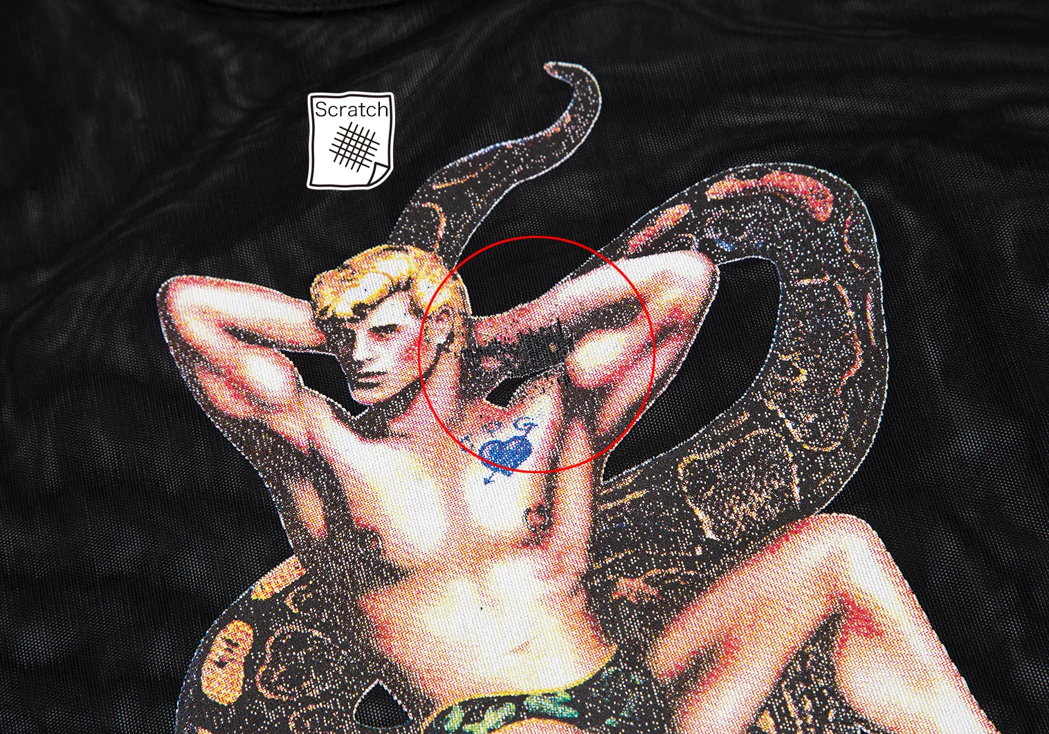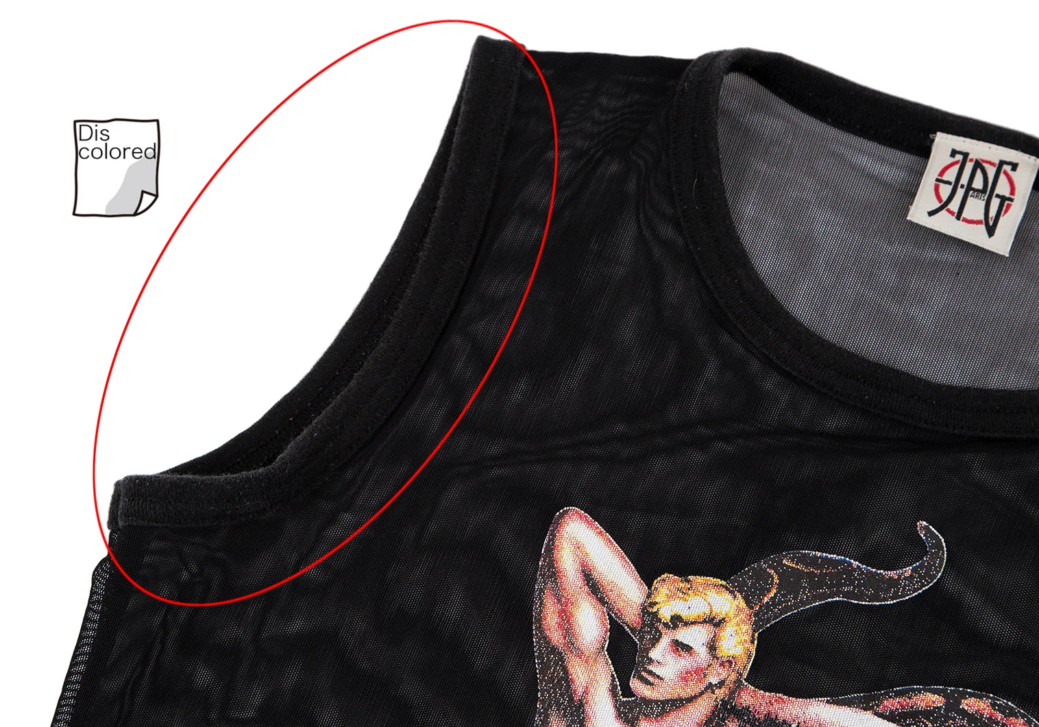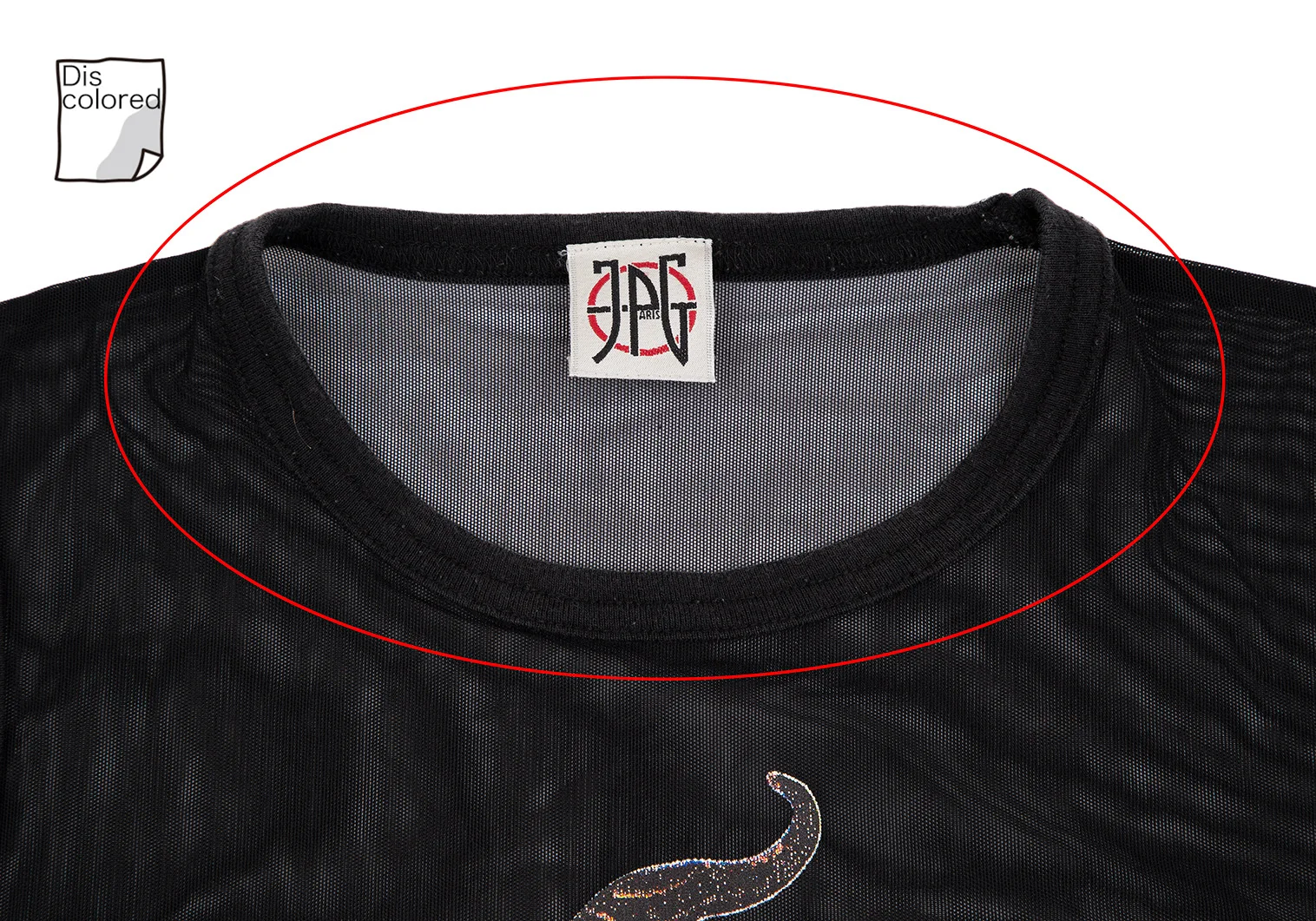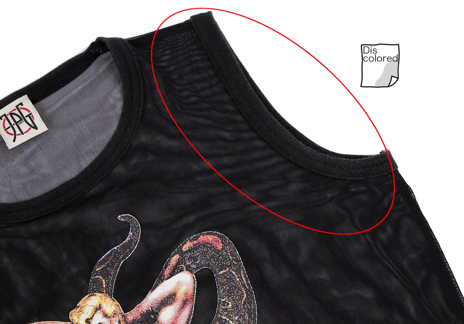 透け感があります。プリントに剥がれ、襟・アームホールに色褪せ、裾ステッチ切れがあります。(写真参照)その他目立ったシミ、汚れ、ほつれ等はありません。クリーニング済み