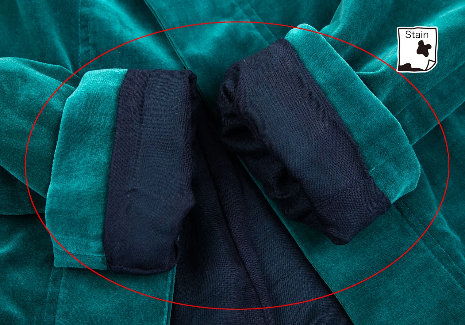 全体にスレ、首周り・袖山に若干の変色、前立てにピン跡、袖裏に汚れがあります(写真参照)。その他目立ったシミ、汚れ、ほつれ等はありません。クリーニング済み