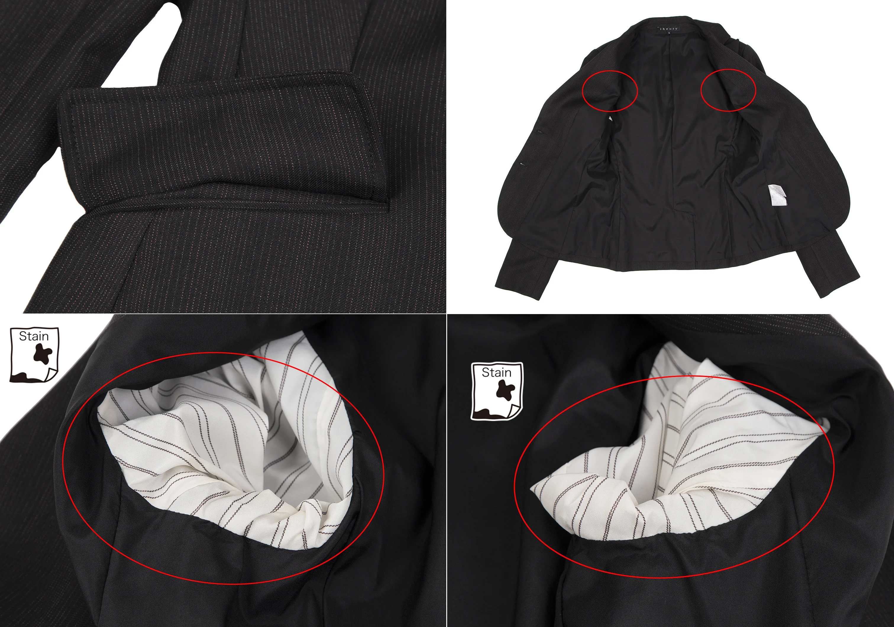 ジャケット:肩パッドがあります。脇裏地に薄シミがありま。パンツ:ウエスト見返し部分に汚れがあります(写真参照)。その他目立ったシミ、汚れ、ほつれ等なくいい状態です。クリーニング済み