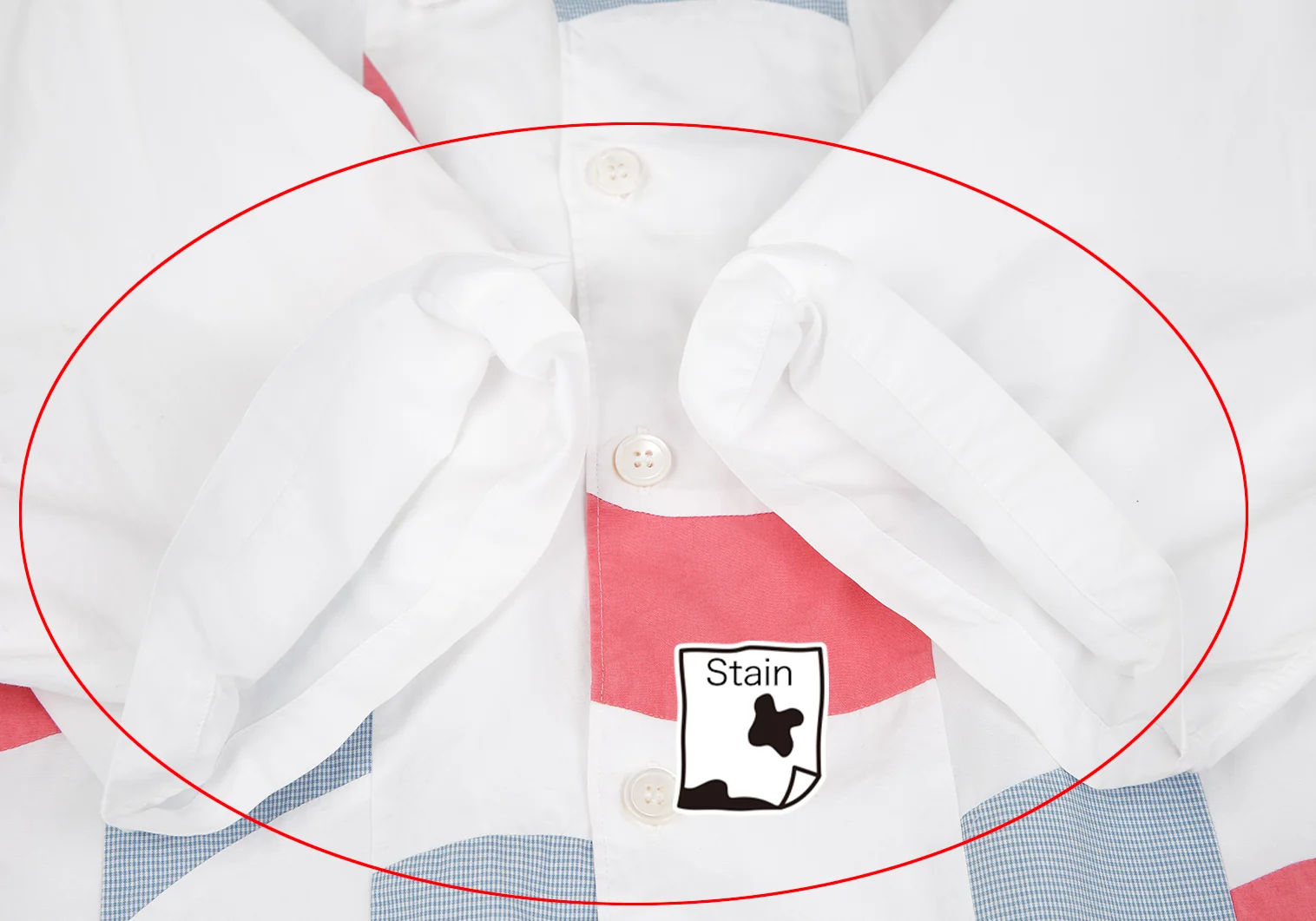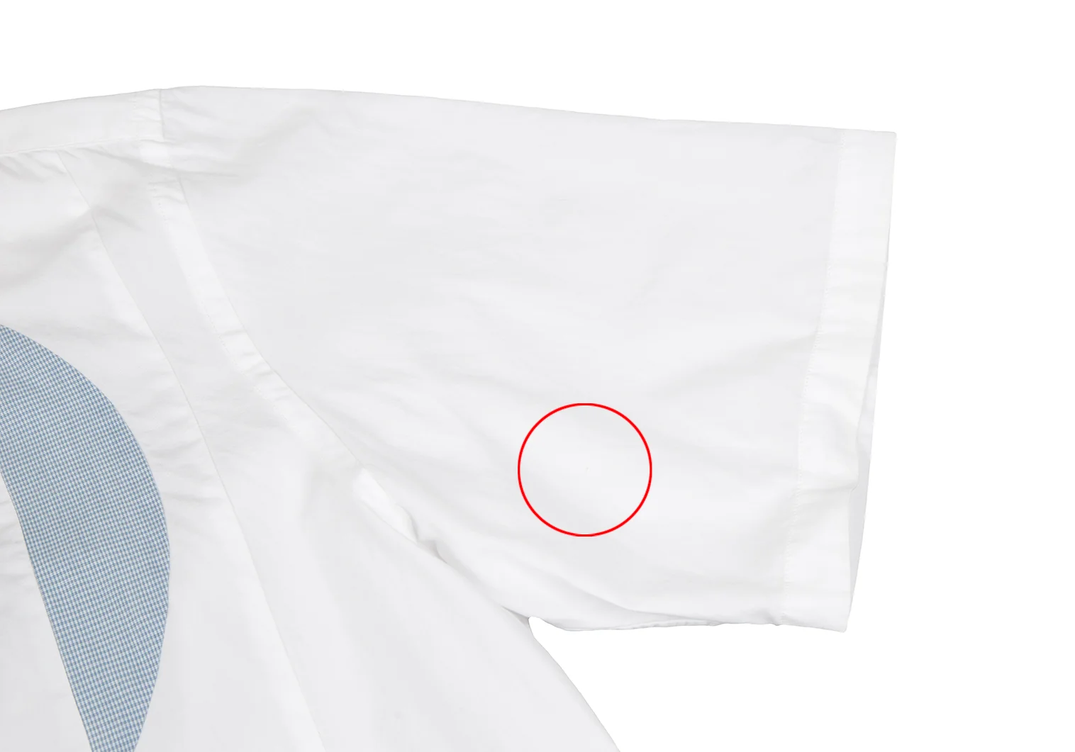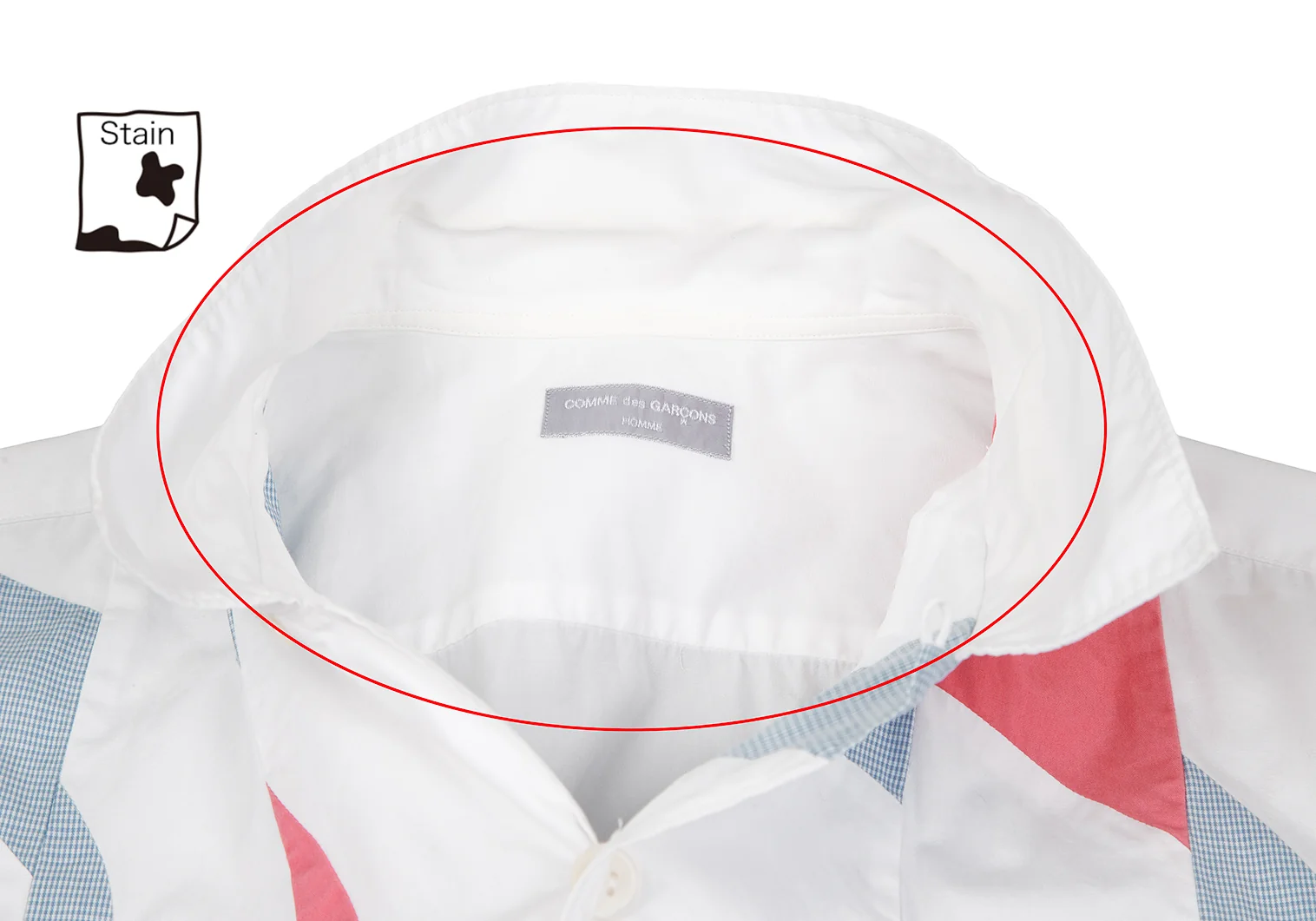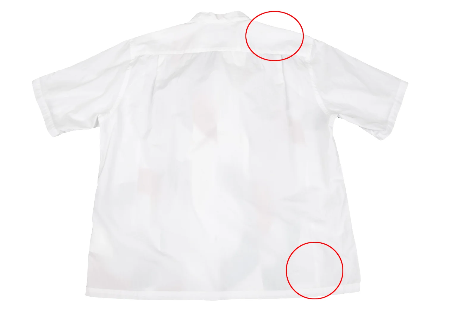 透け感があります。品質タグ印字が薄れています。襟元・袖口・身頃に薄汚れ、左袖・身頃に点シミがあります(写真参照)。クリーニング済み