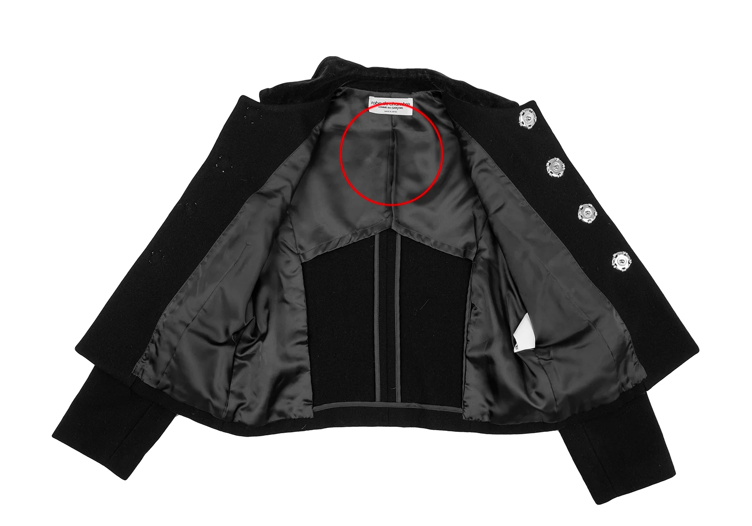 品質表示タグにネームの書き込みがあります。襟裏に汚れ、裏地に糸引きがあります(写真参照)。その他目立ったシミ、汚れ、ほつれ等なくいい状態です。クリーニング済み