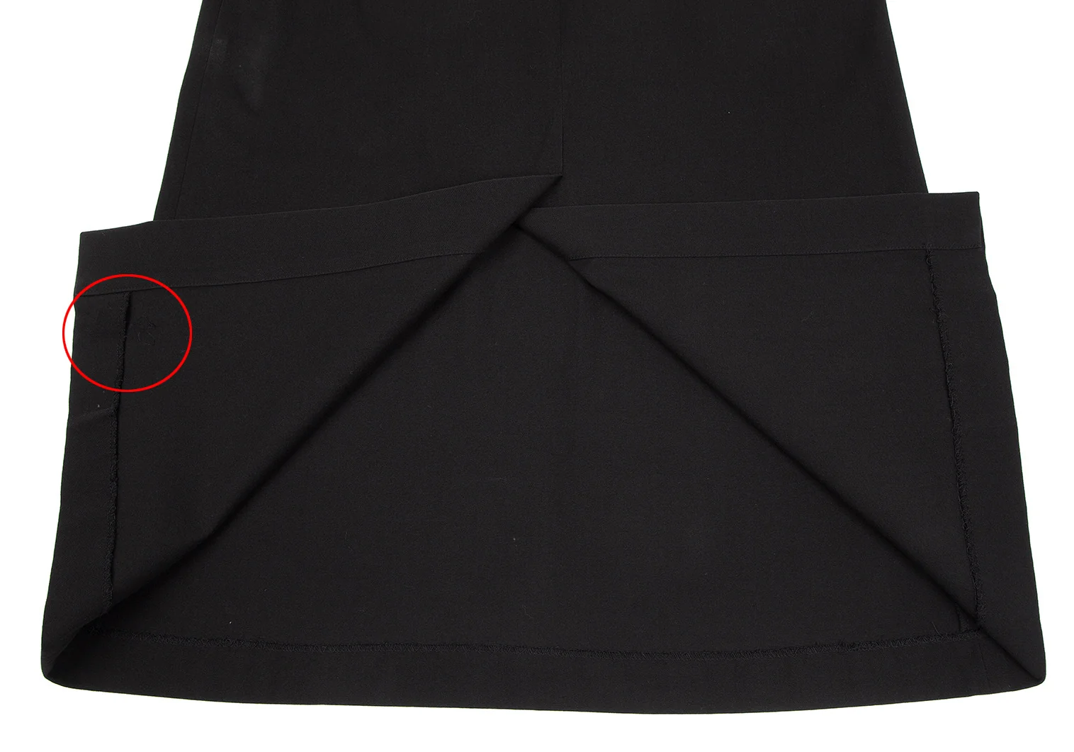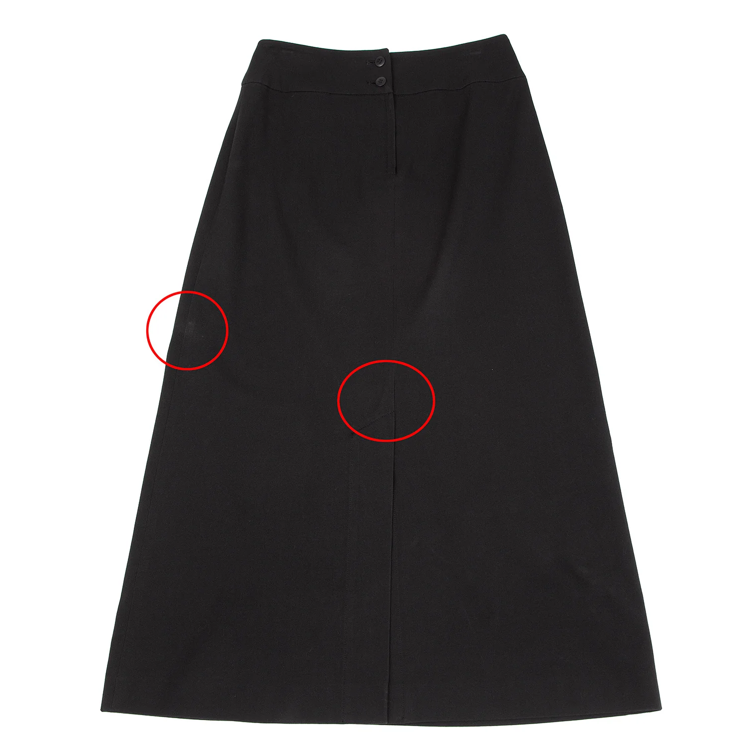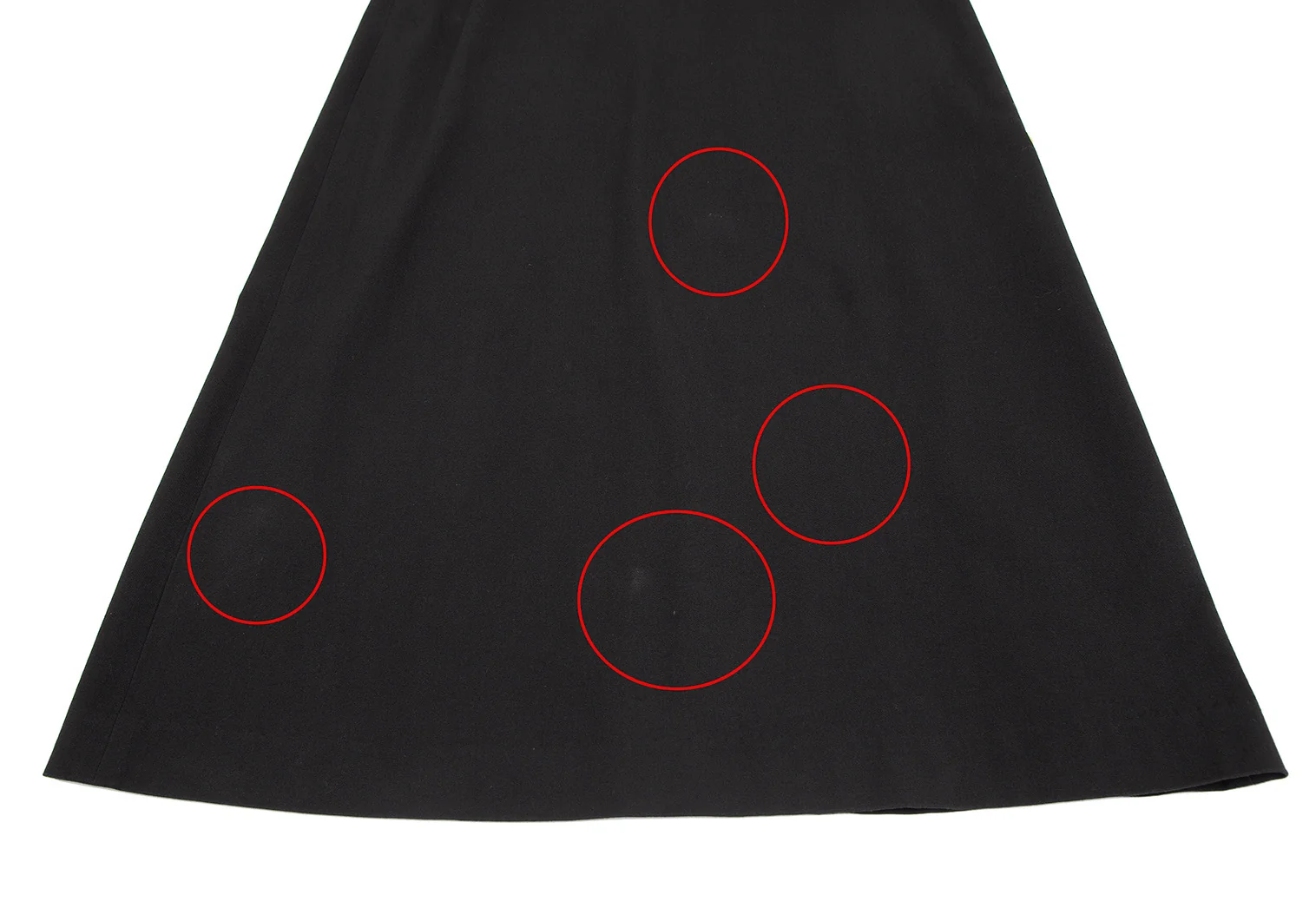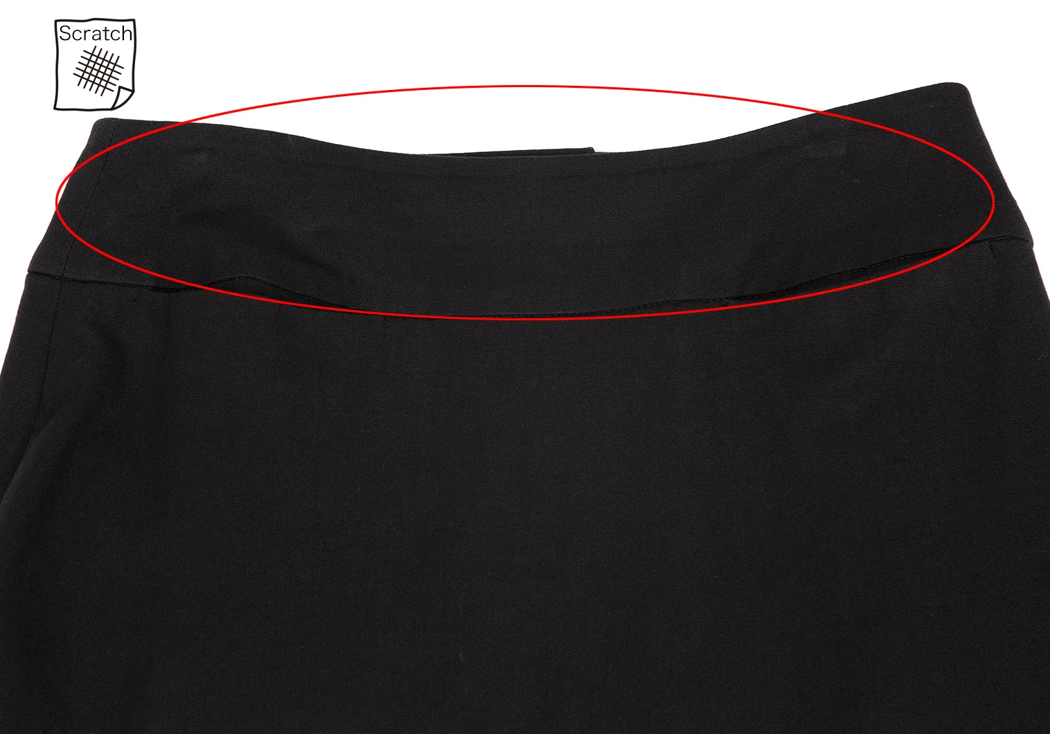 ウエスト周りに擦れ、前に汚れ、裾裏にほつれがあります(写真参照)。その他目立ったシミ、汚れ、ほつれ等はありません。クリーニング済み