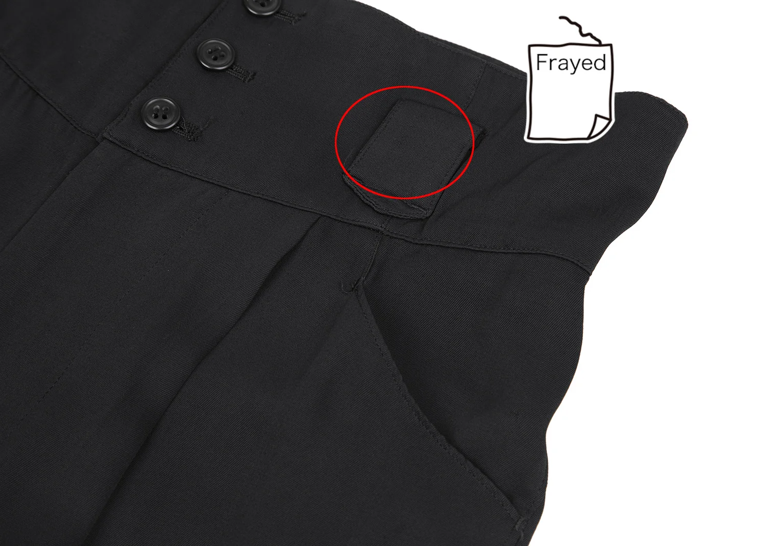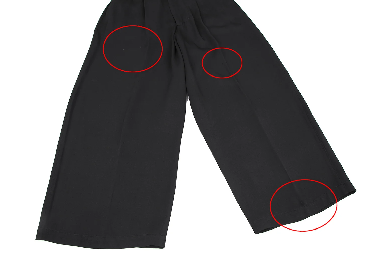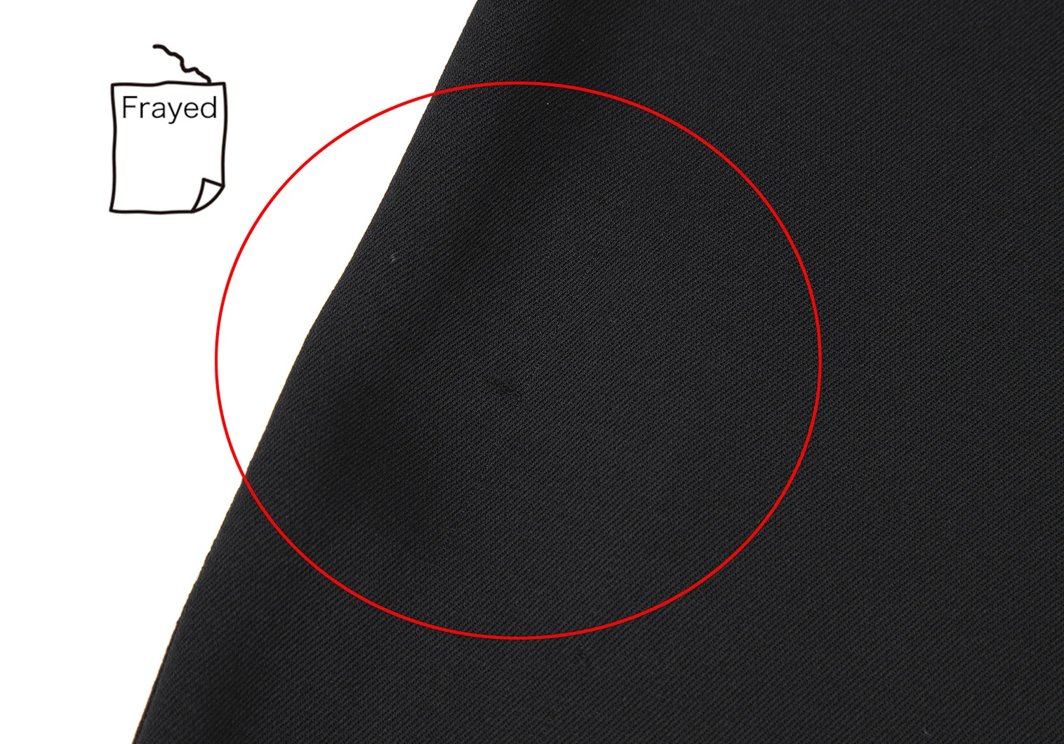 タグにネーム書き込みがあります。前右腿・前左裾に汚れ、前ベルトループ・前左足・後ろ左足に引っかけがあります(写真参照)。その他目立ったシミ、汚れ、ほつれ等なくいい状態です。クリーニング済み