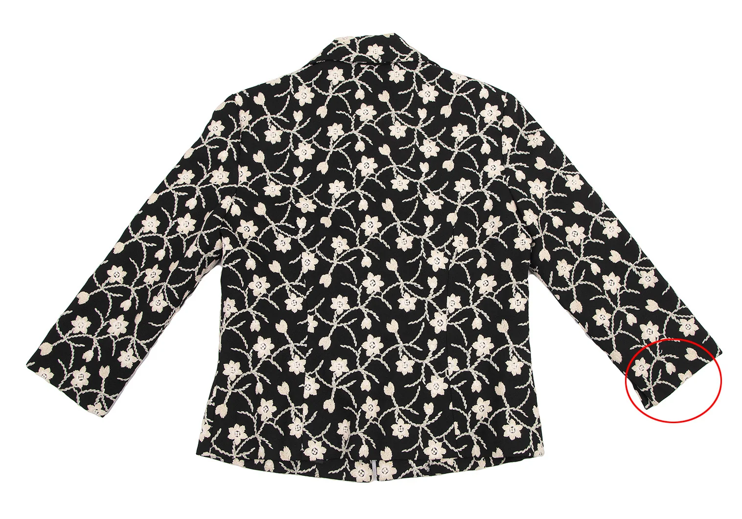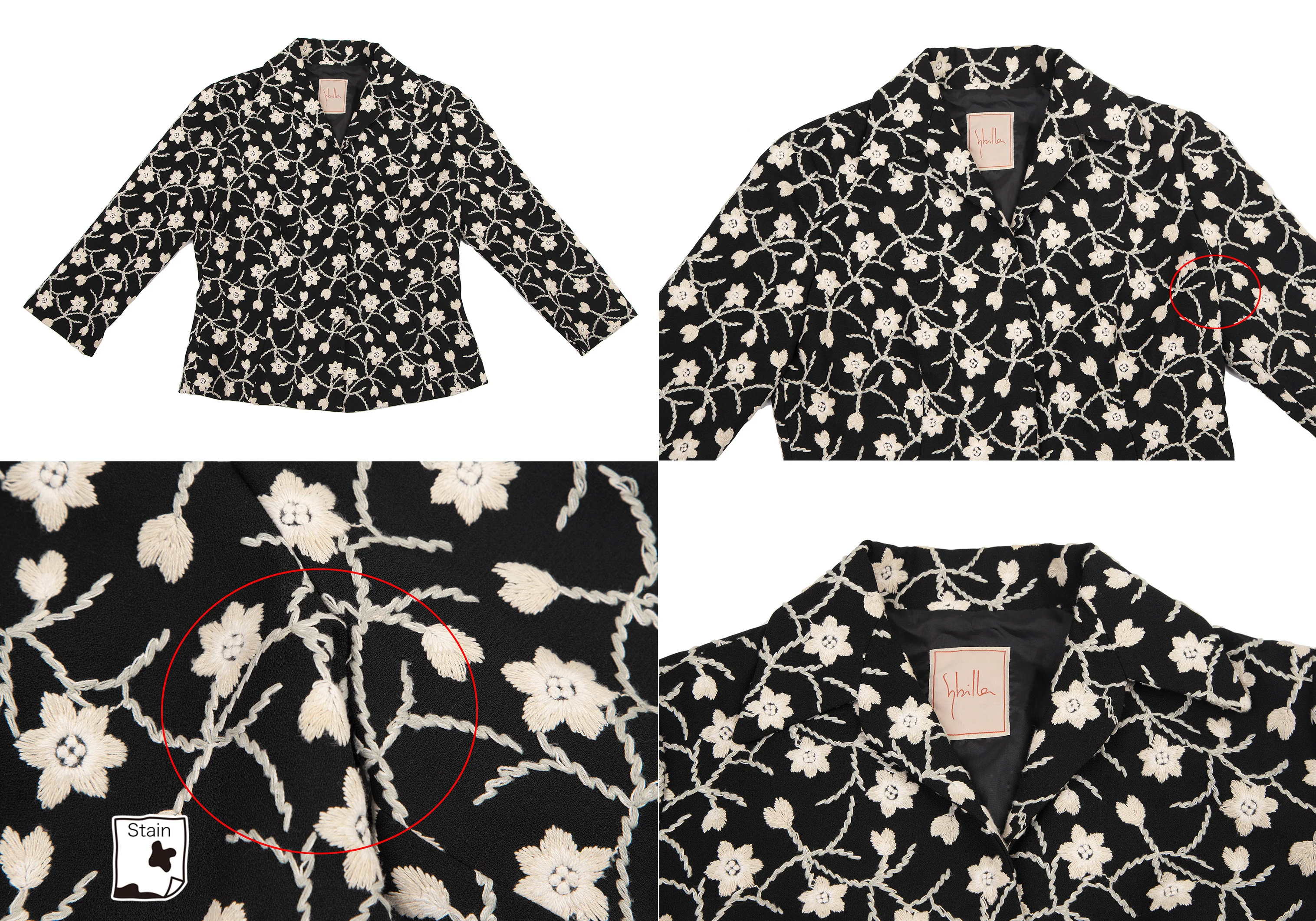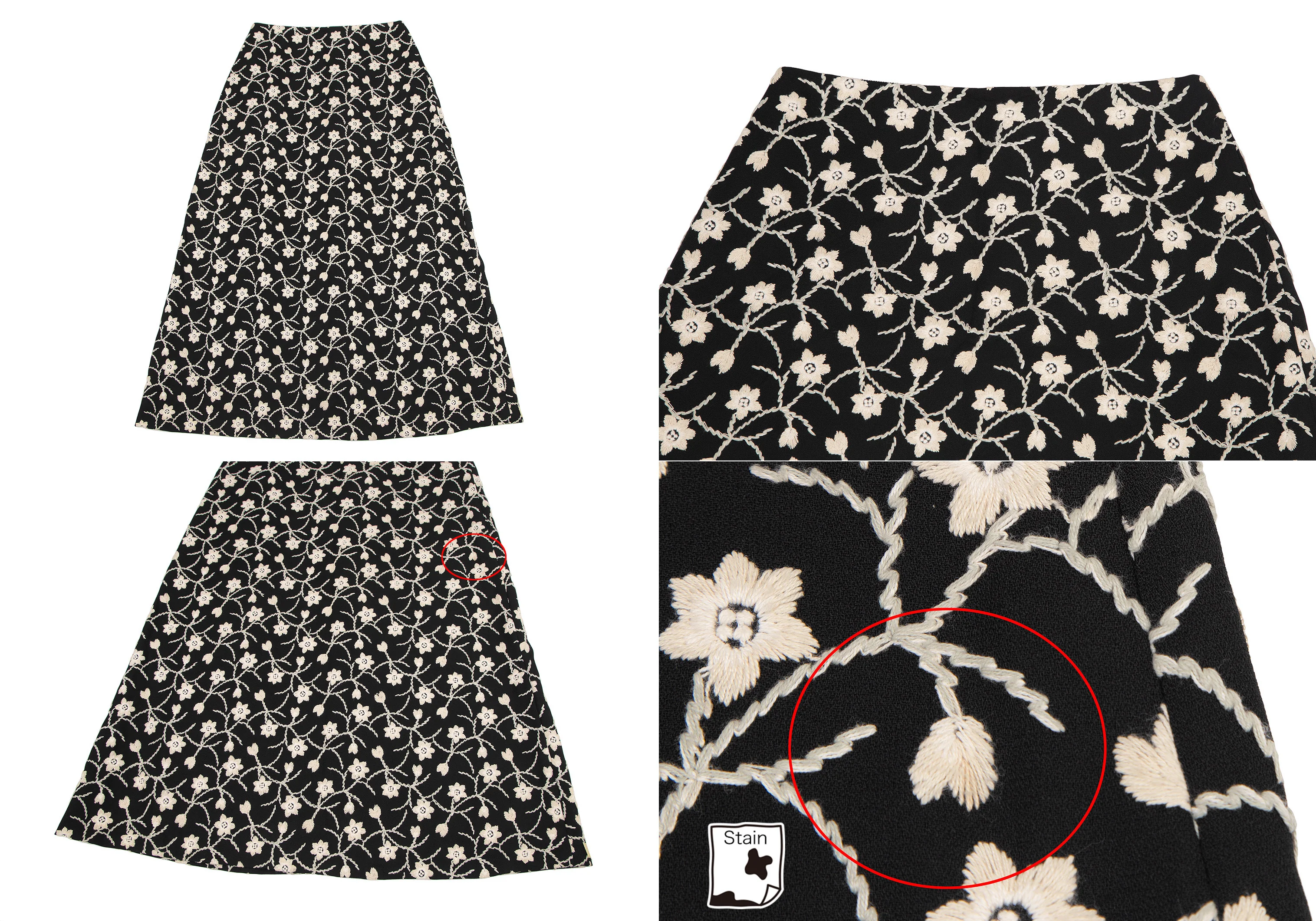 ジャケット:左脇・左袖先・後ろ右袖先・袖裏にシミがあります。スカート:前身頃・後ろ左裾先にシミ、裾裏ロック縫い部分にほつれがあります(写真参照)。その他目立ったシミ、汚れ、ほつれ等なくいい状態です。クリーニング済み