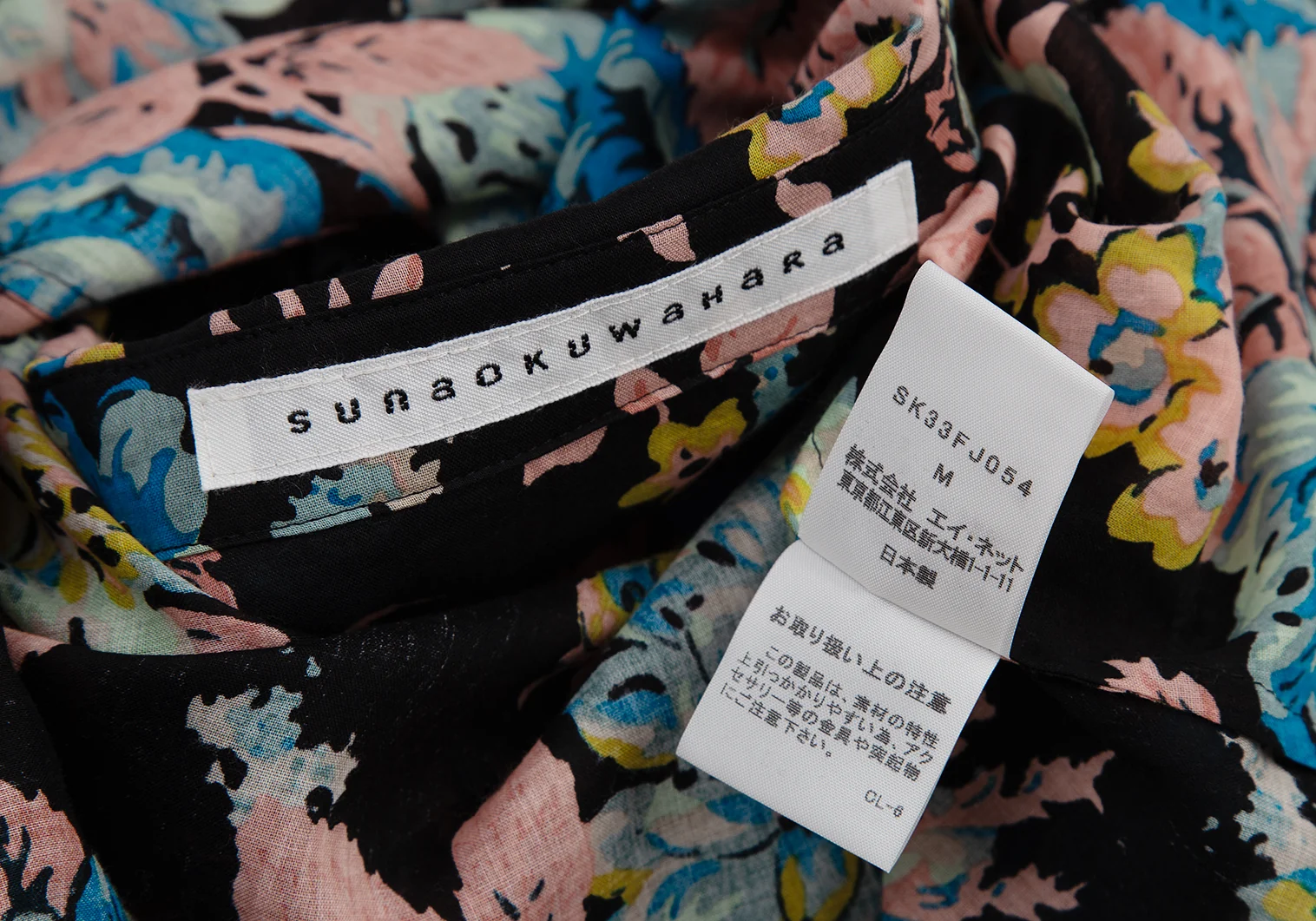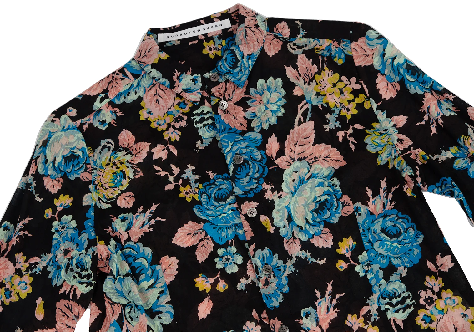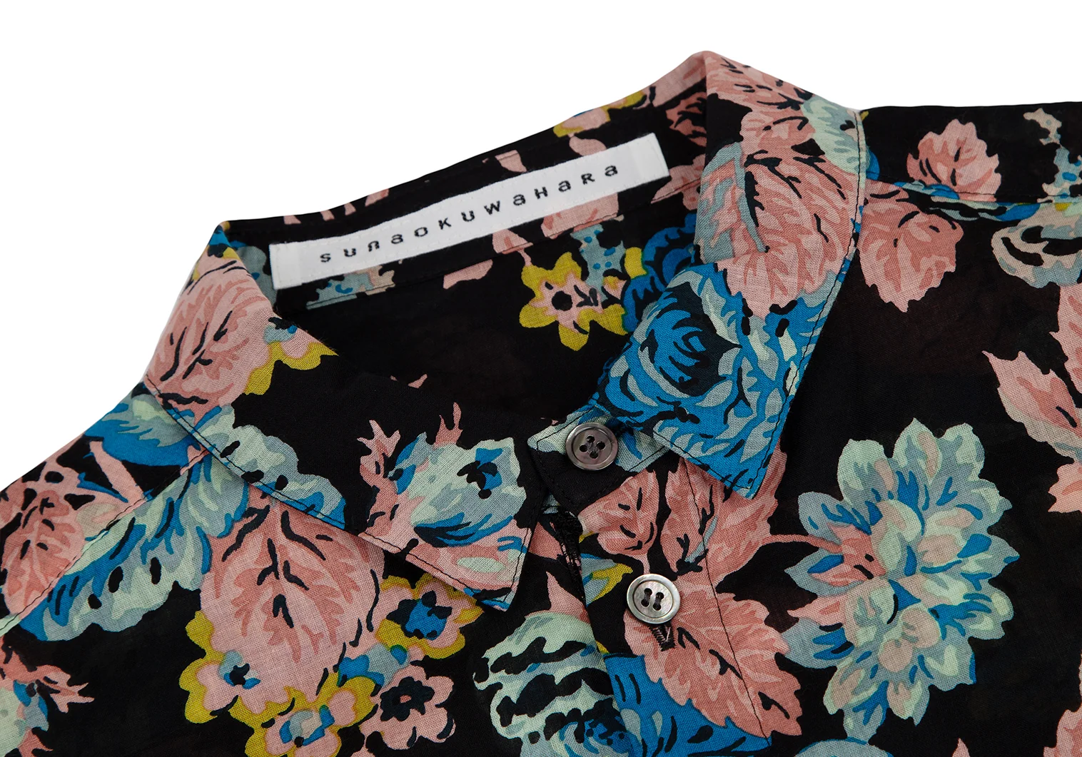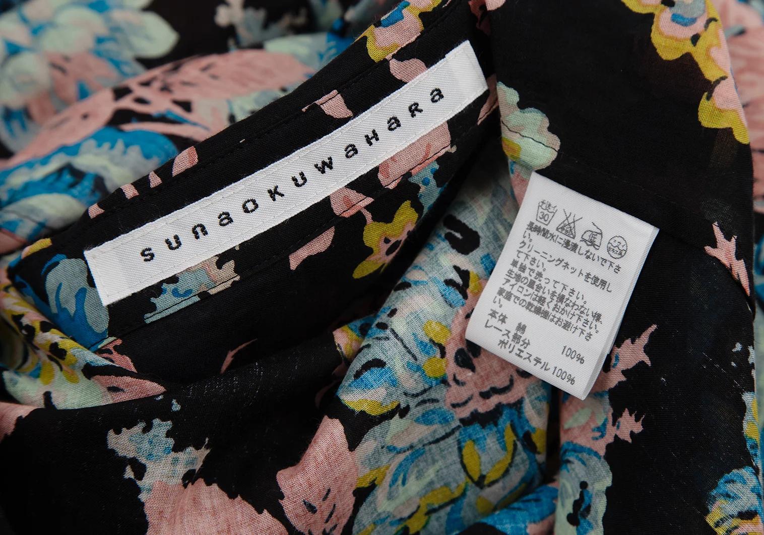 スナオクワハラsunaokuwahara レースフロント切替コットンボタニカルプリント長袖シャツ 黒マルチM