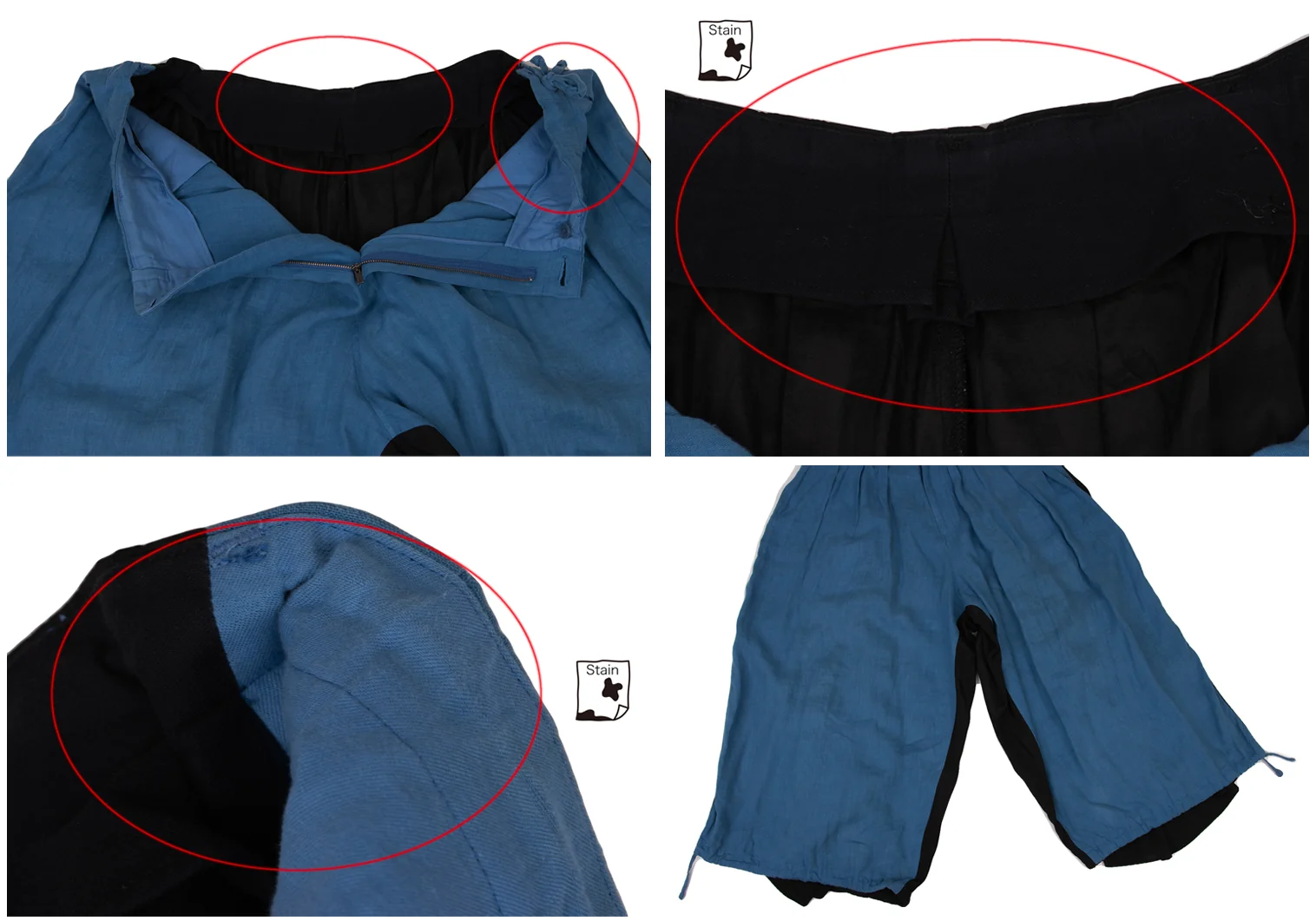 2019S/Sコレクション 前身頃・ウエスト裏に薄シミ、前身頃に引っ掛け、裾口に擦り切れ、裾裏に裂け、ポケット袋布・後ろ裾に汚れがあります(写真参照)。クリーニング済み