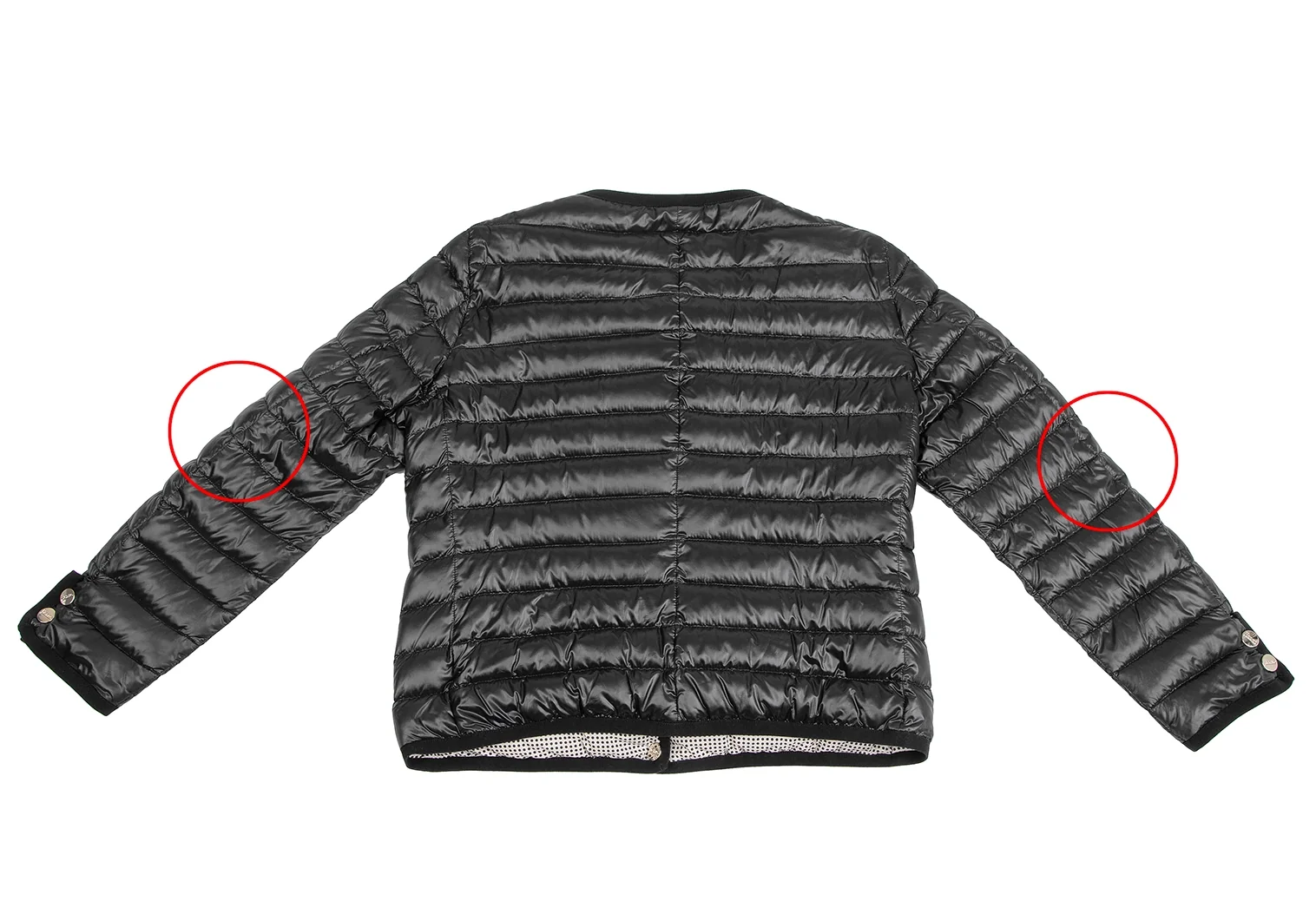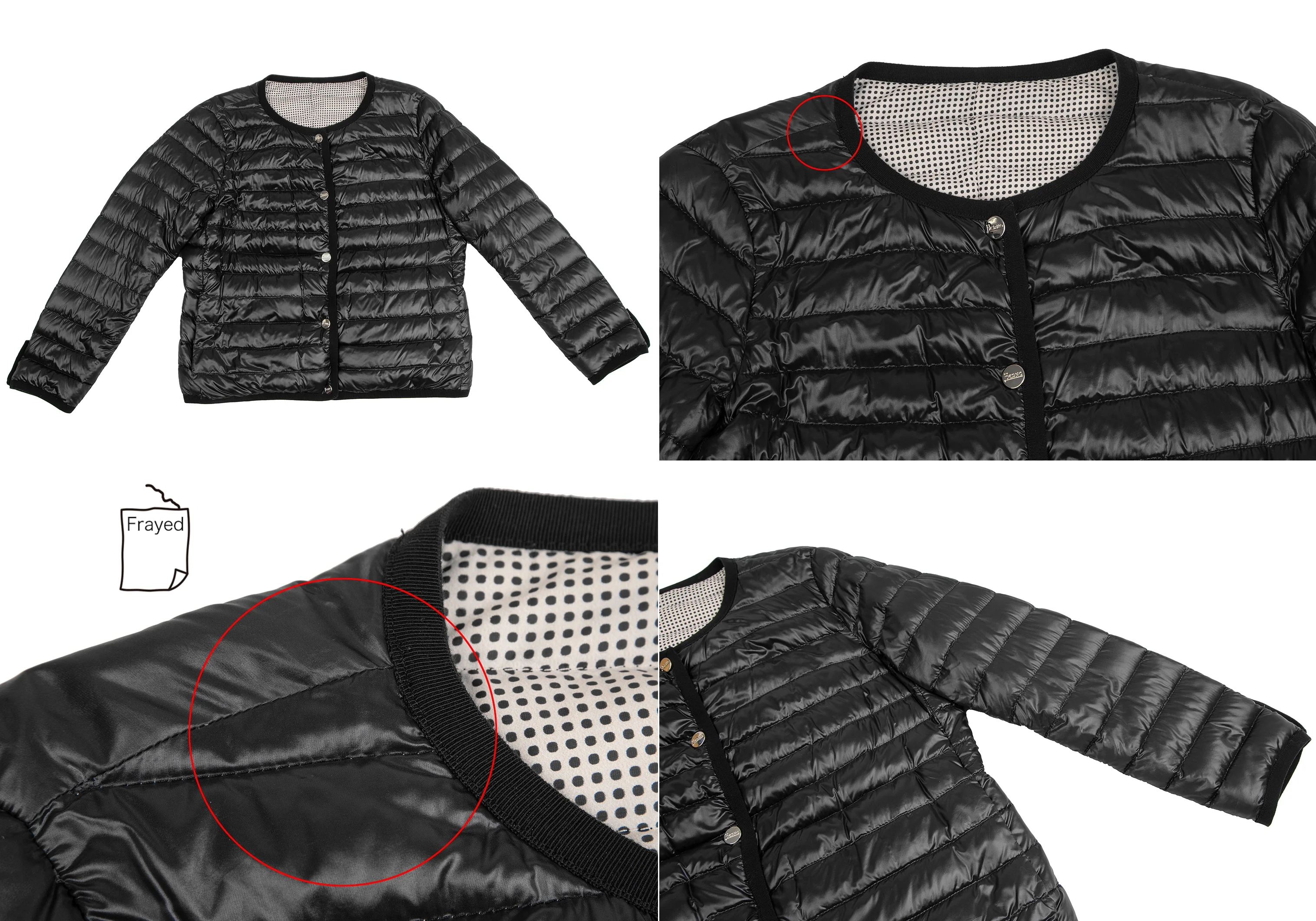 紺側の首元・袖にステッチ切れがあります。(写真参照)その他目立ったシミ、汚れ、ほつれ等なくいい状態です。クリーニング済み