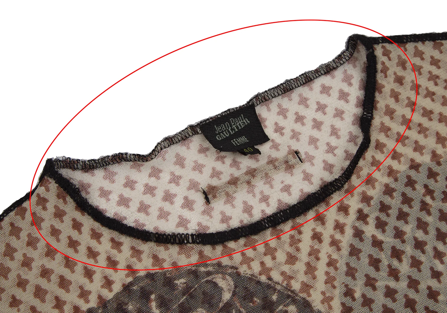 透け感があります。襟ぐりゴムに劣化があります。(写真参照)その他目立ったシミ、汚れ、ほつれ等なくいい状態です。クリーニング済み