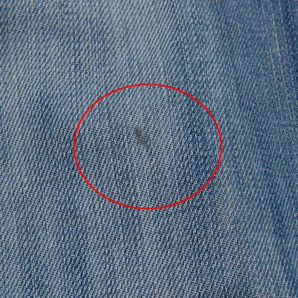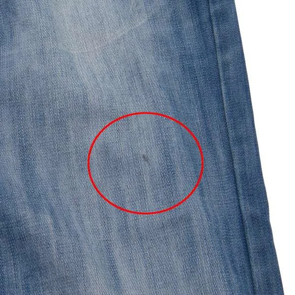 左足前身頃にシミあり。後ろ左腰辺りに薄シミあり。両裾ダメージあり(写真参照)。クリーニング済み