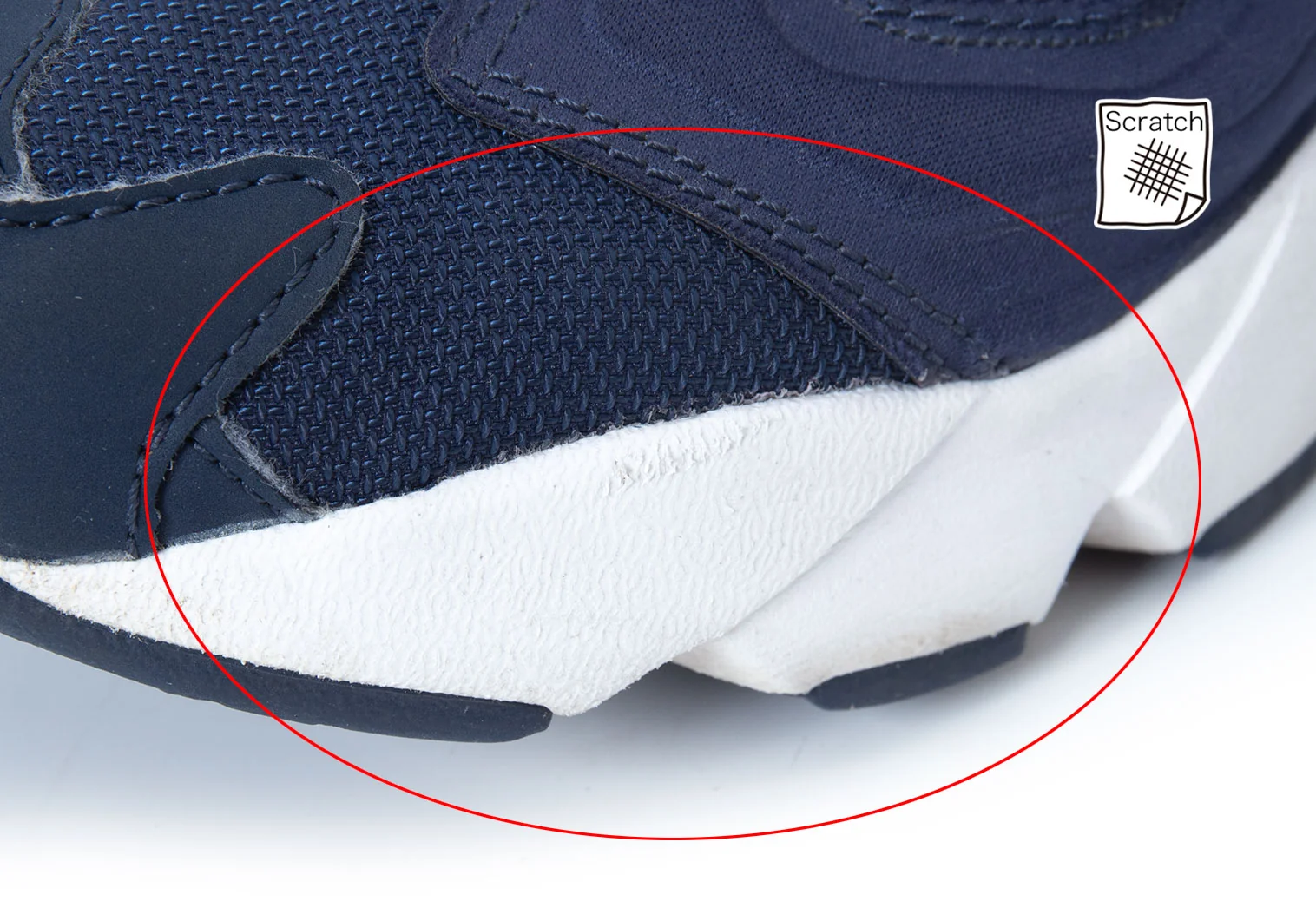 サイドに擦れキズ、履き口に擦れ、インソールプリントに剥がれがあります(写真参照)。その他目立った傷や汚れなどなくいい状態です。