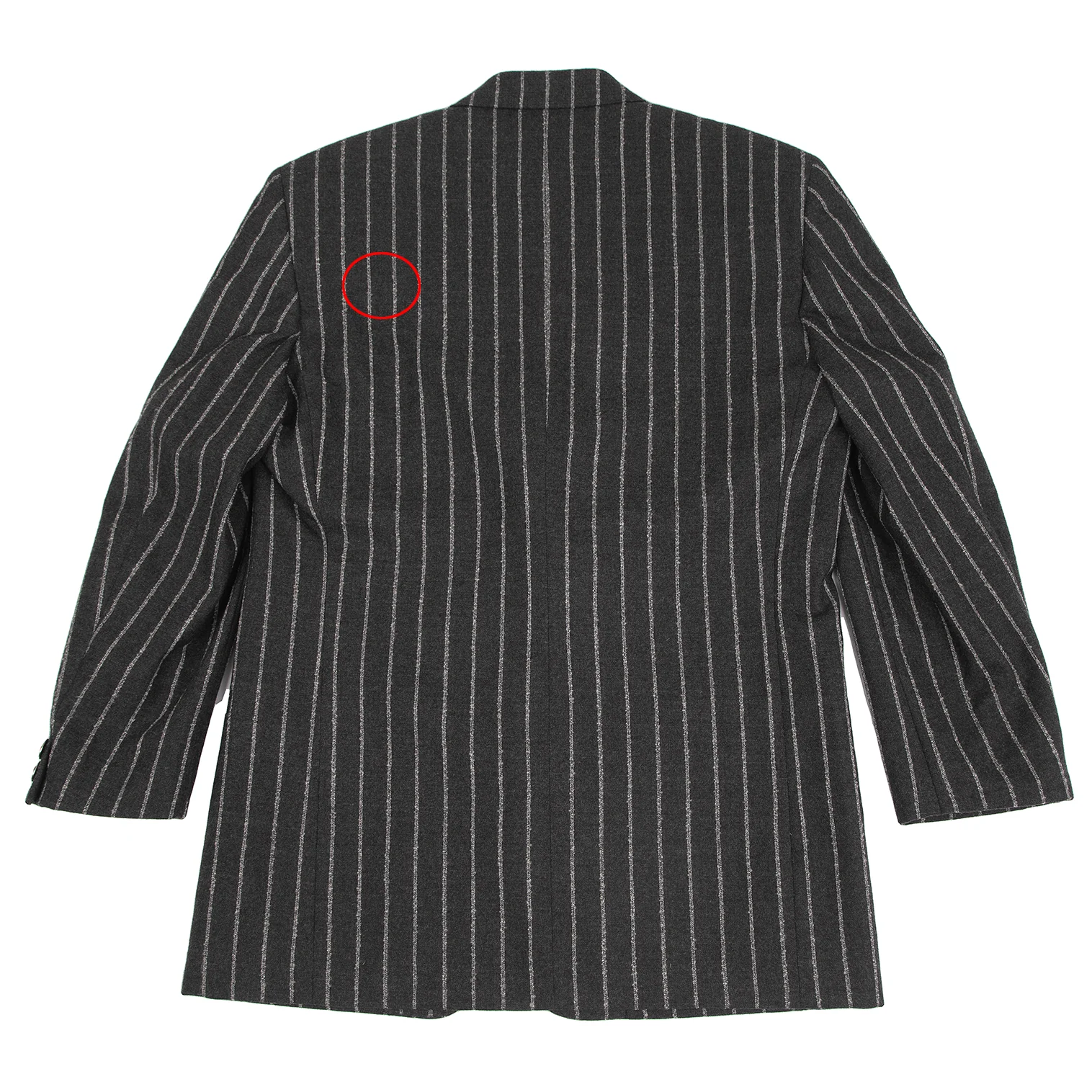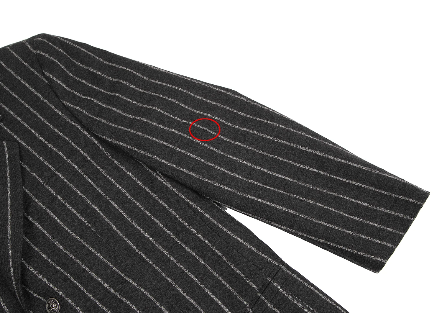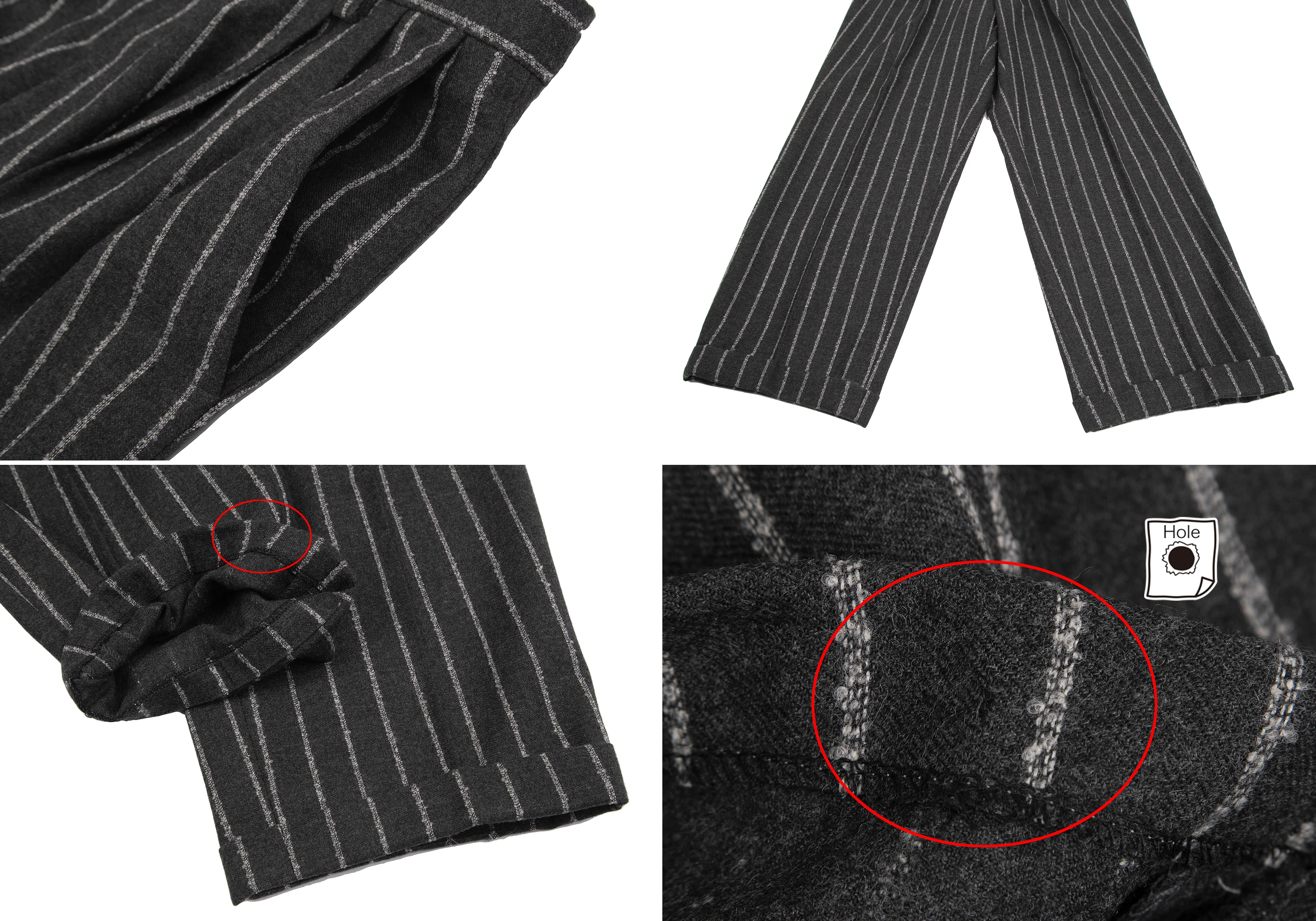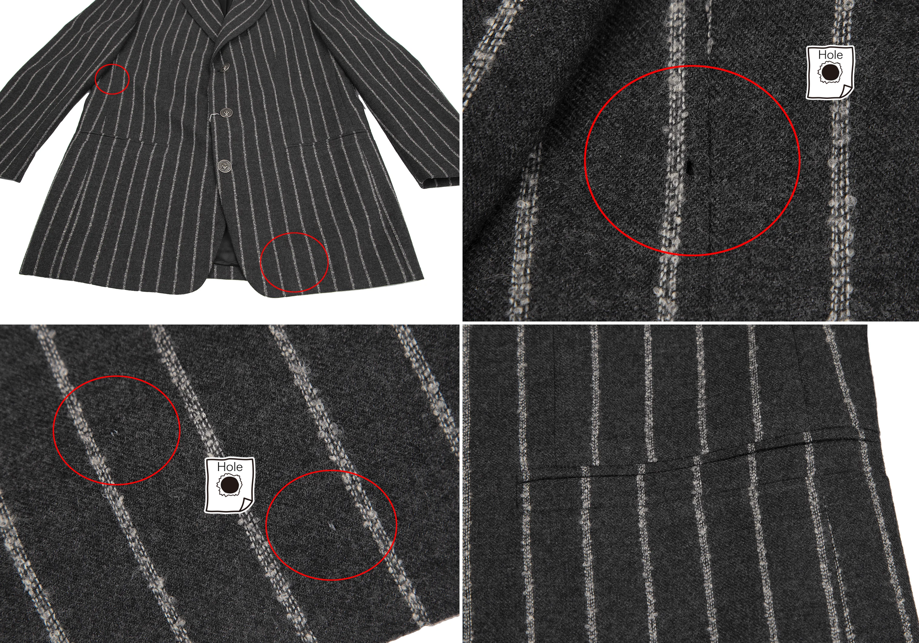 ジャケット:左袖に引っ掛け、身頃に複数の穴あきがあります。パンツ:ウエスト裏に薄シミ、右裾裏に穴あきがあります。(写真参照)その他目立ったシミ、汚れ、ほつれ等ありません。クリーニング済み