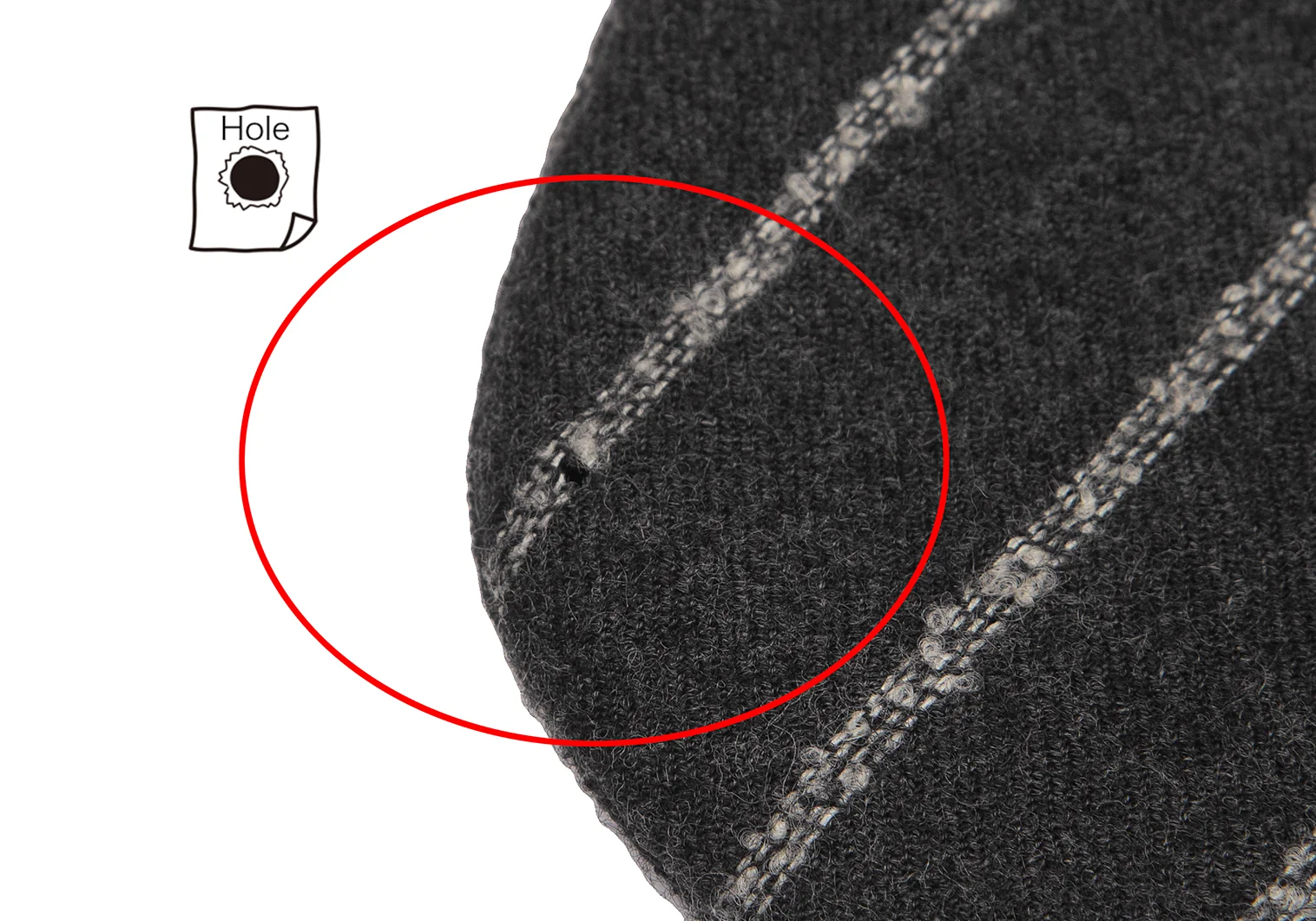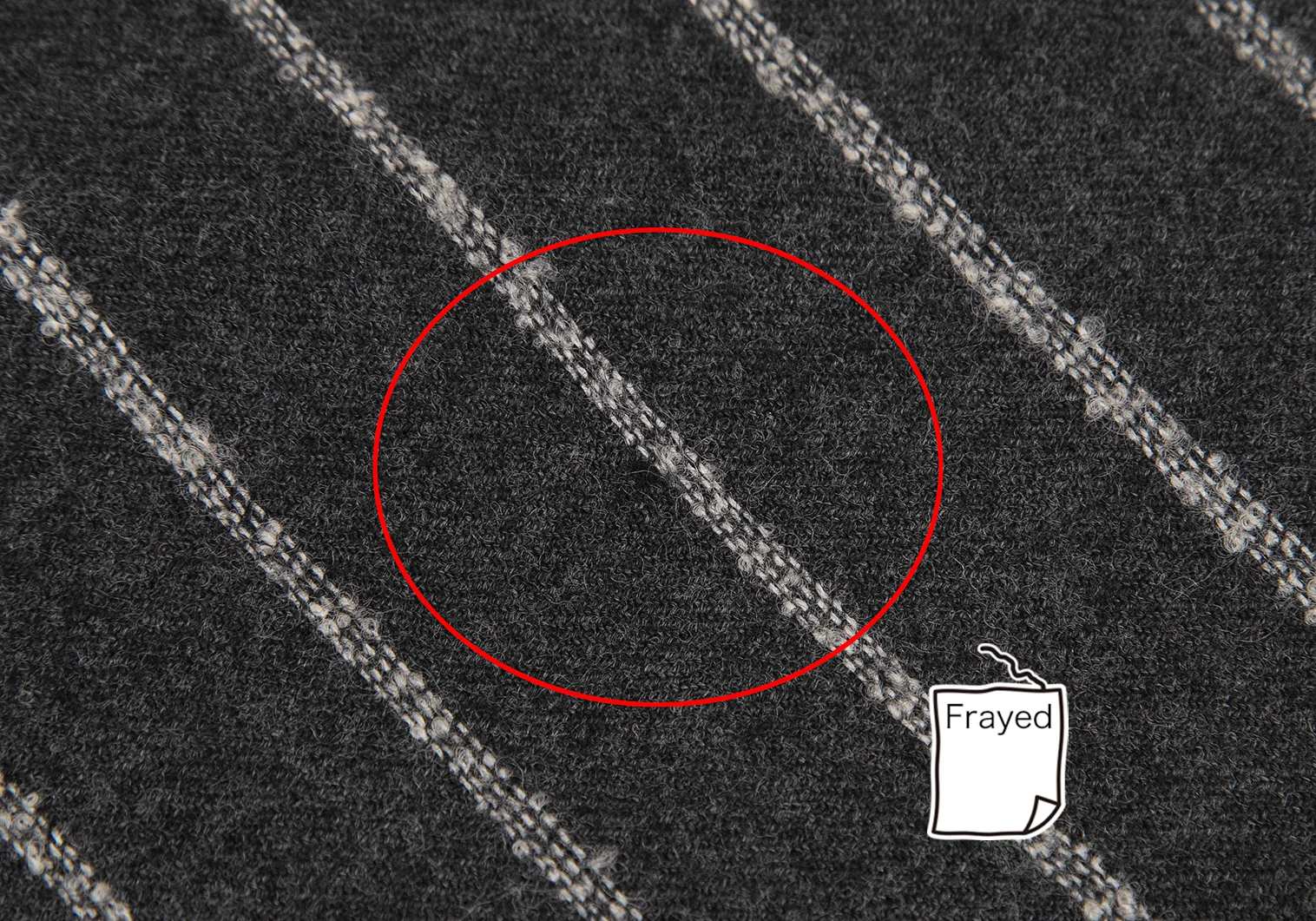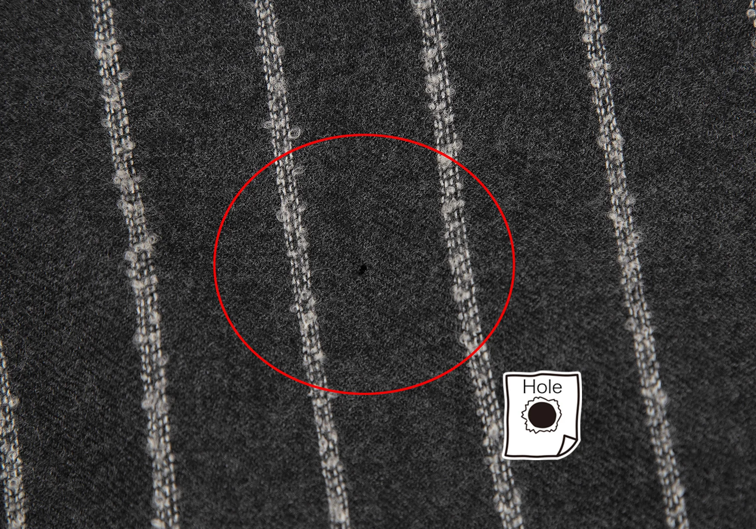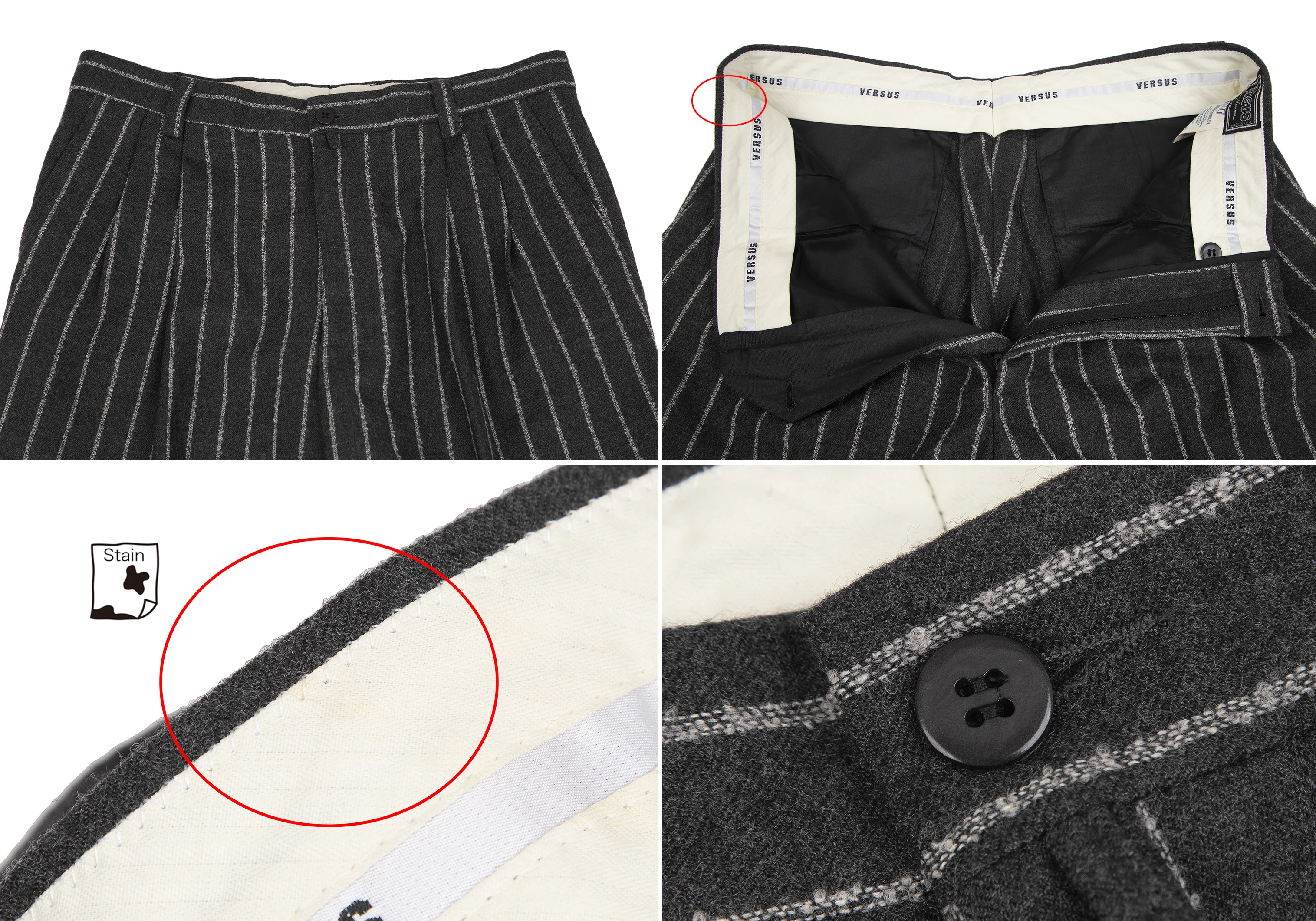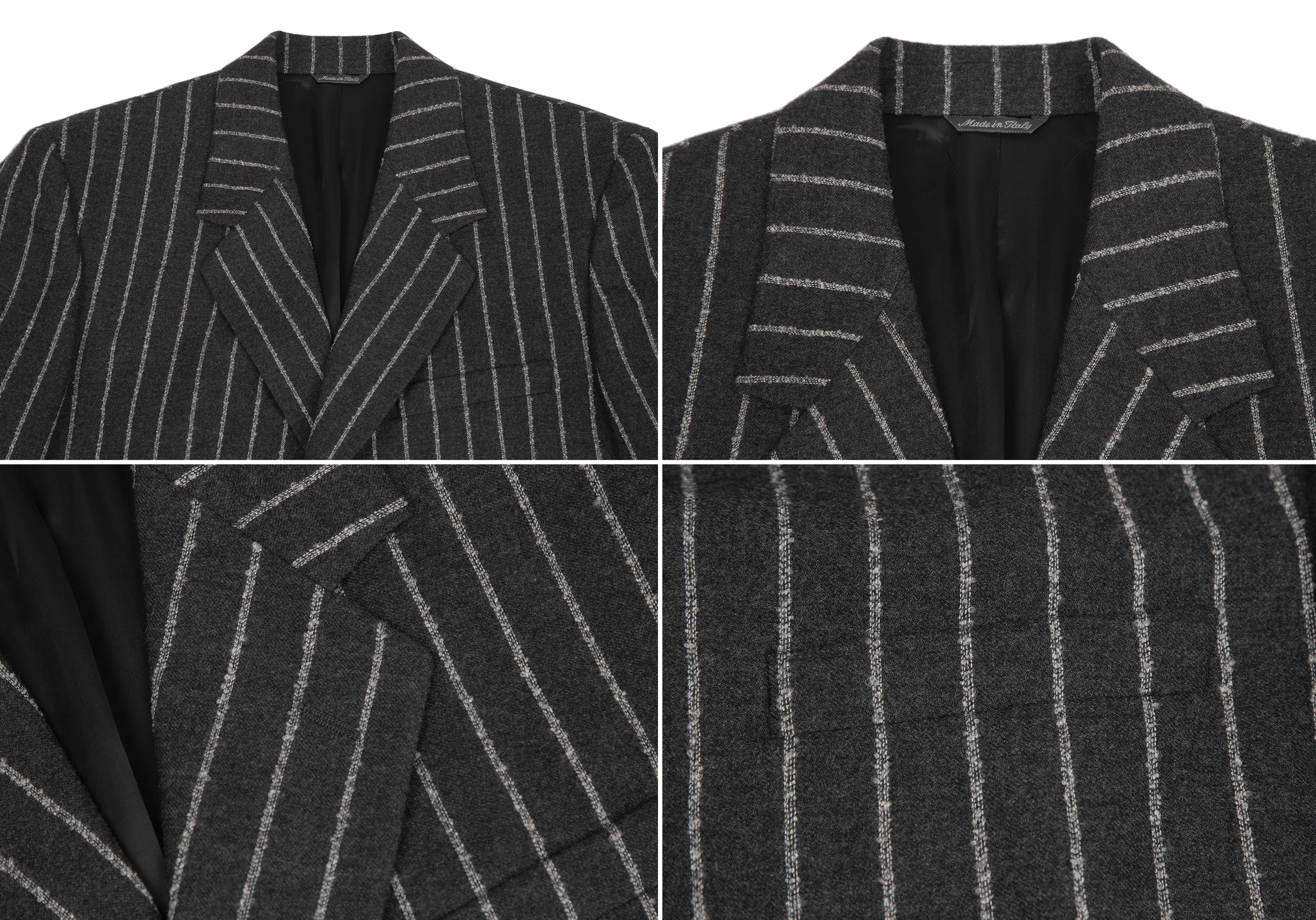 ジャケット:左袖に引っ掛け、身頃に複数の穴あきがあります。パンツ:ウエスト裏に薄シミ、右裾裏に穴あきがあります。(写真参照)その他目立ったシミ、汚れ、ほつれ等ありません。クリーニング済み