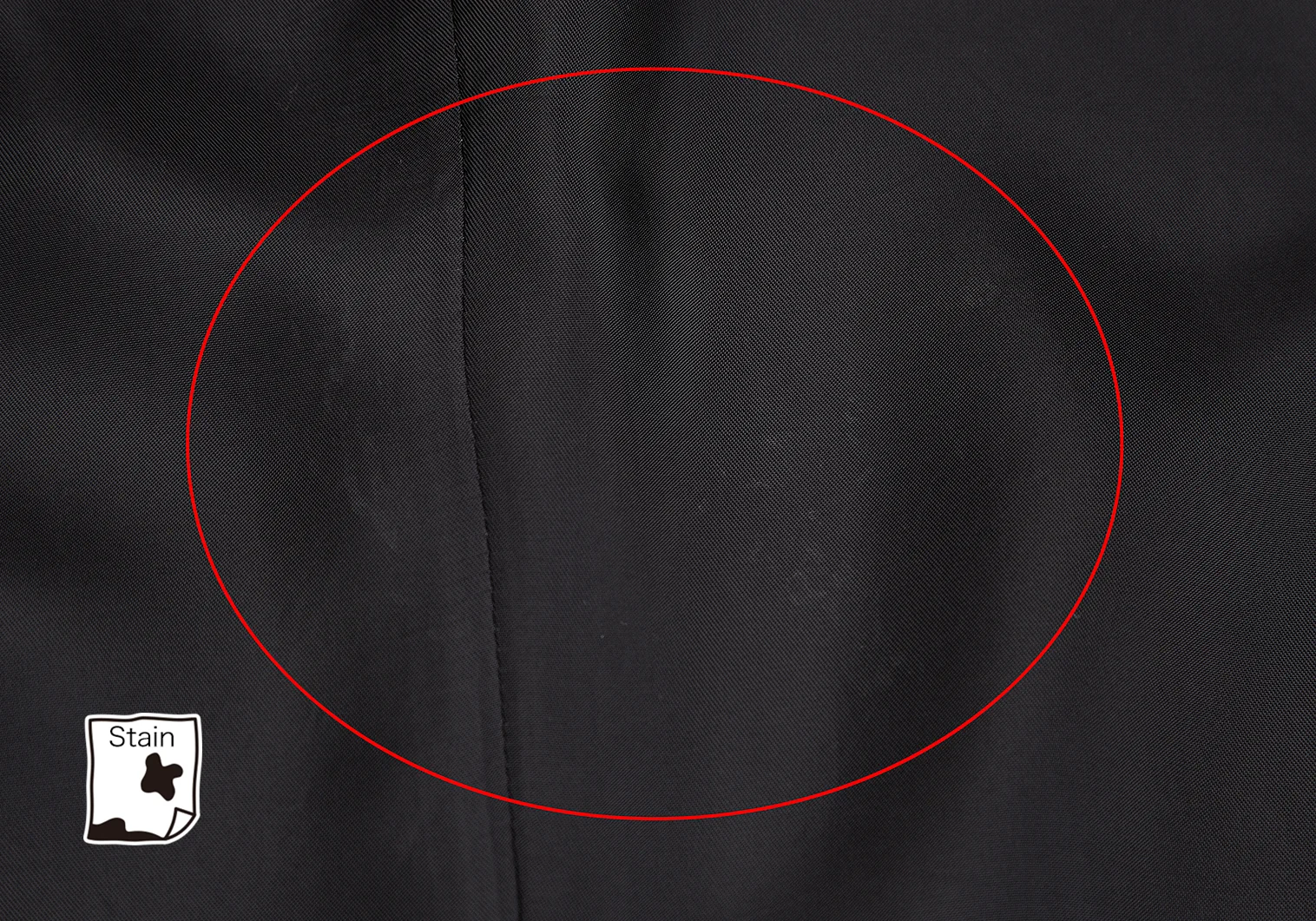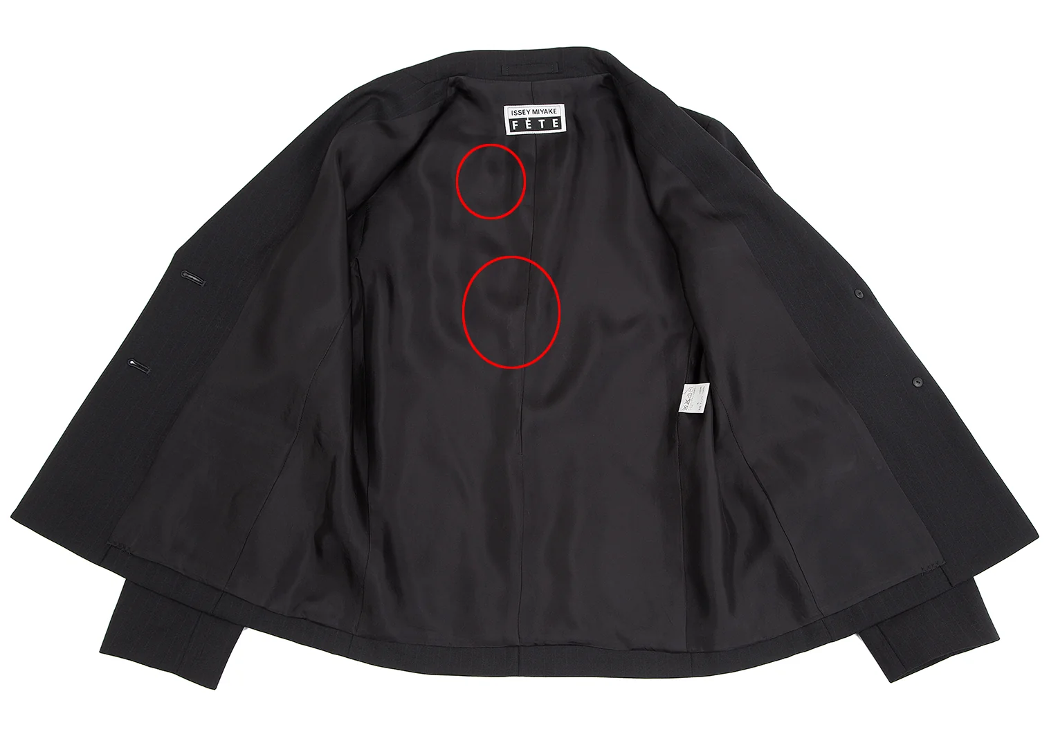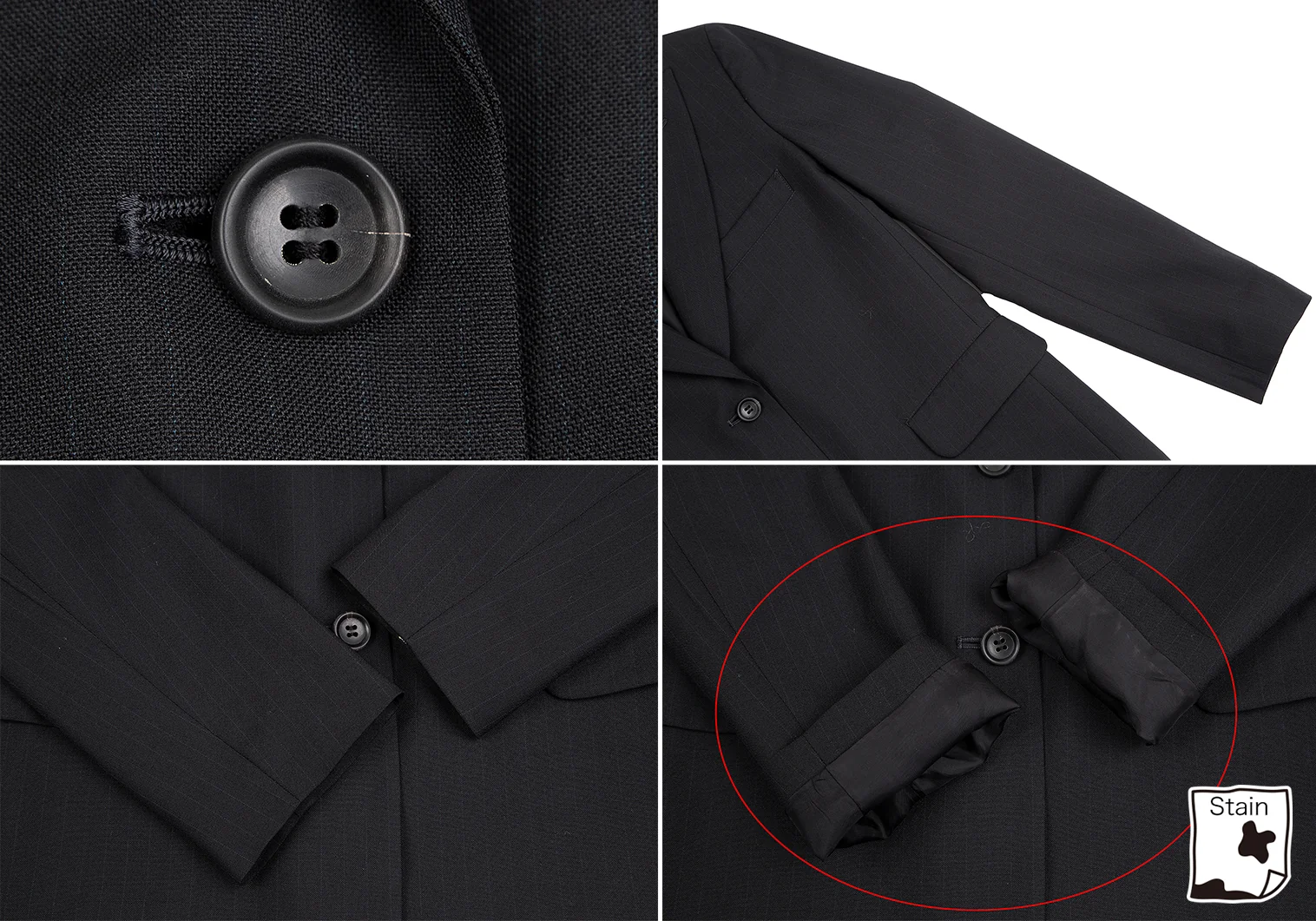 ジャケット:袖裏地・裏地に汚れがあります。パンツ:後ろ左足裾にダメージがあります(写真参照)。その他目立ったシミ、汚れ、ほつれ等なくいい状態です。クリーニング済み