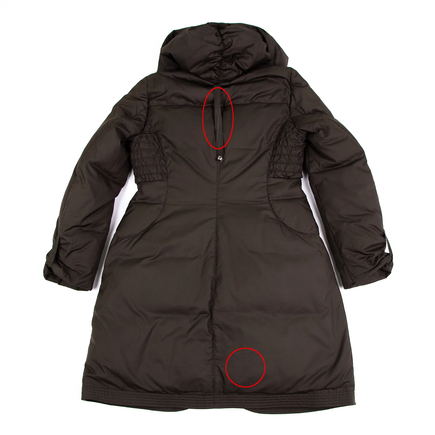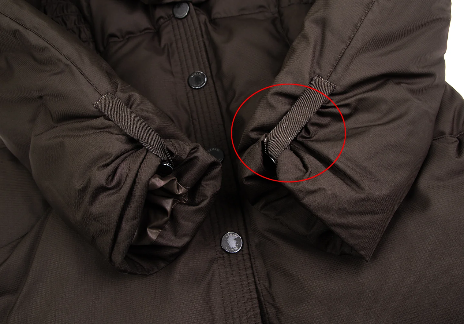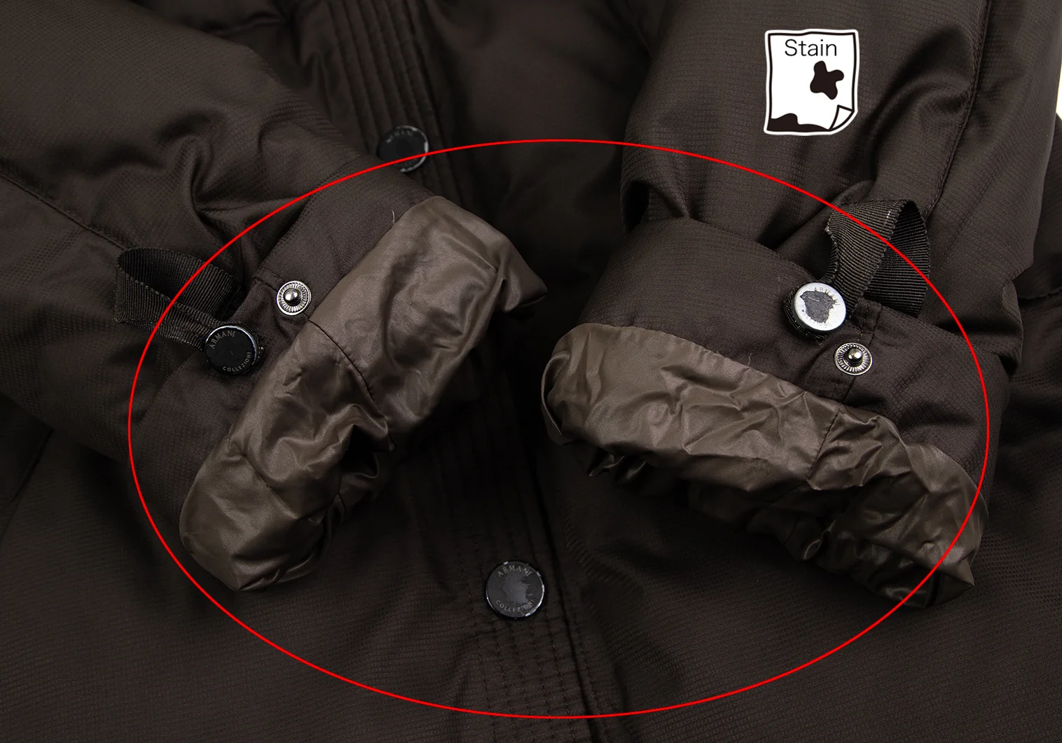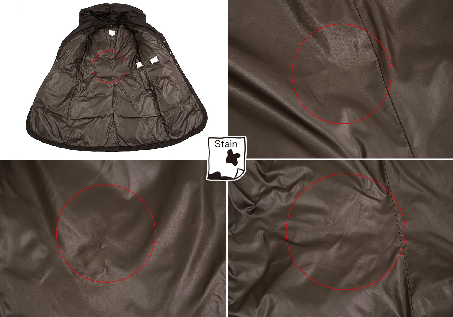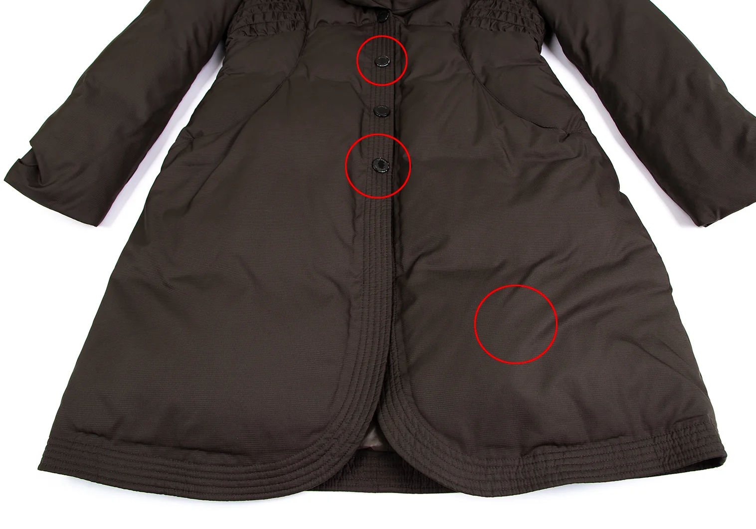 首元・袖裏に汚れ、前後裾・裏地にシミ、ボタン塗装剥がれ、ストラップにスレがあります。(写真参照)クリーニング済み