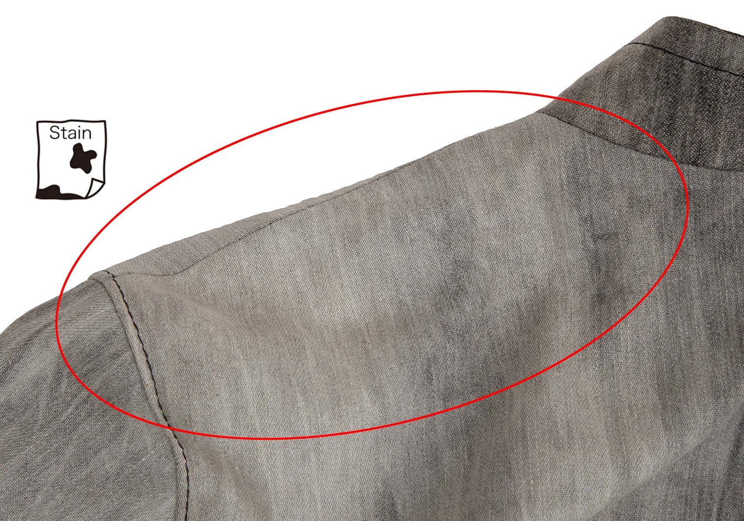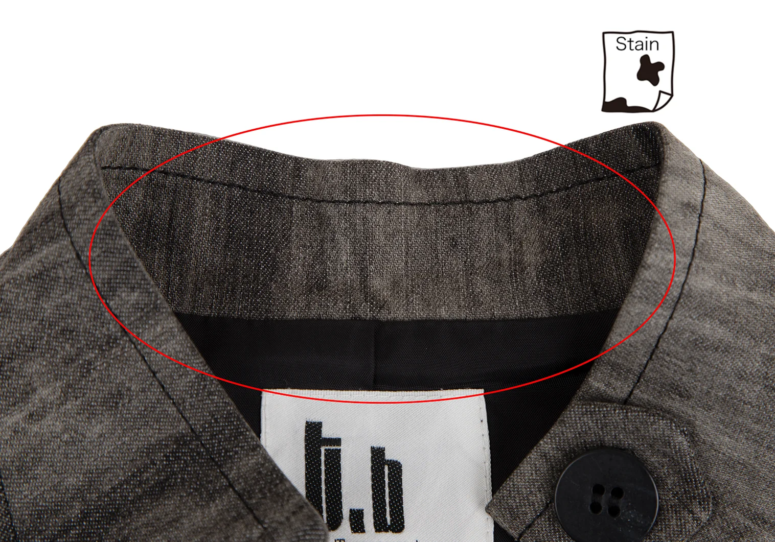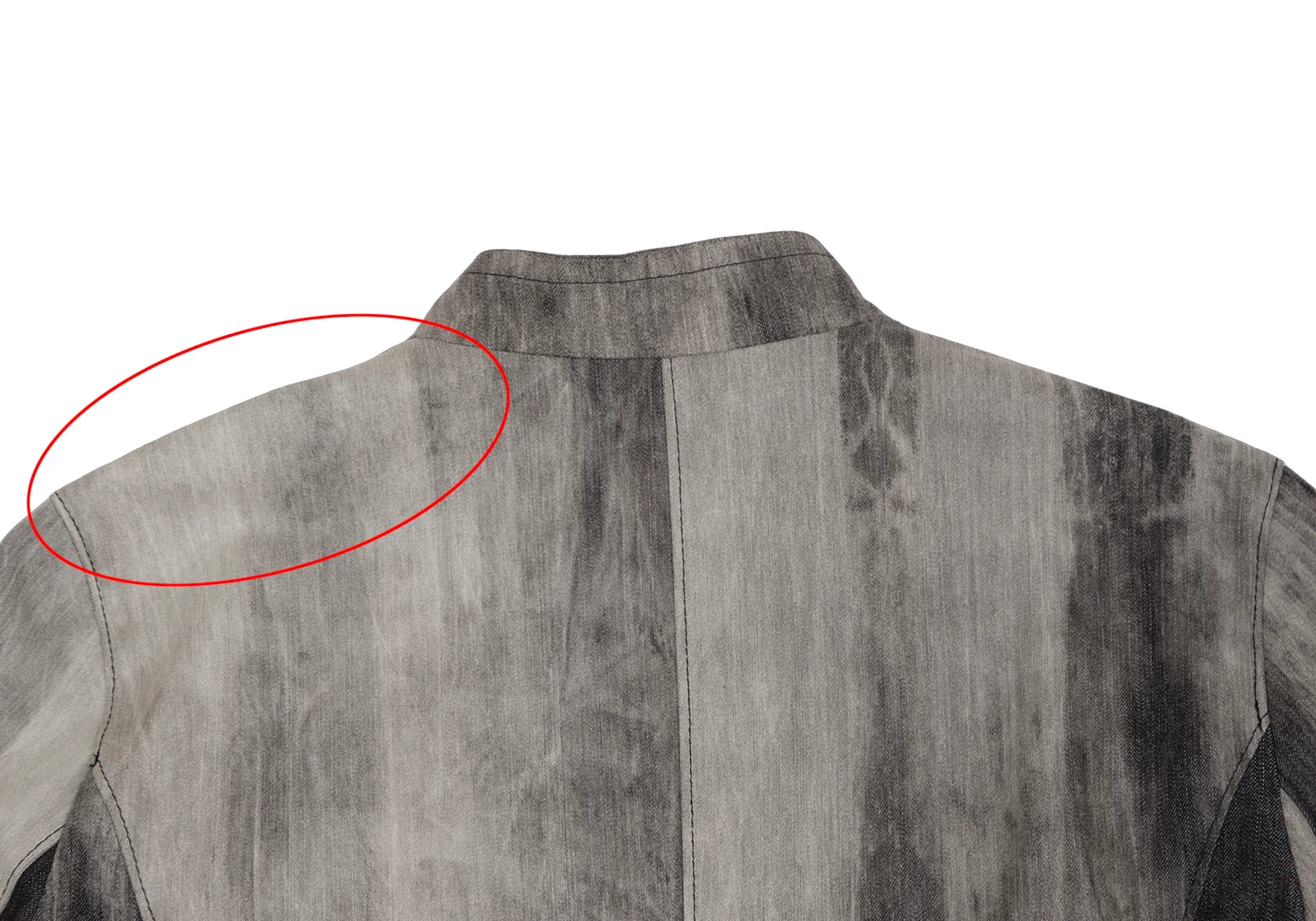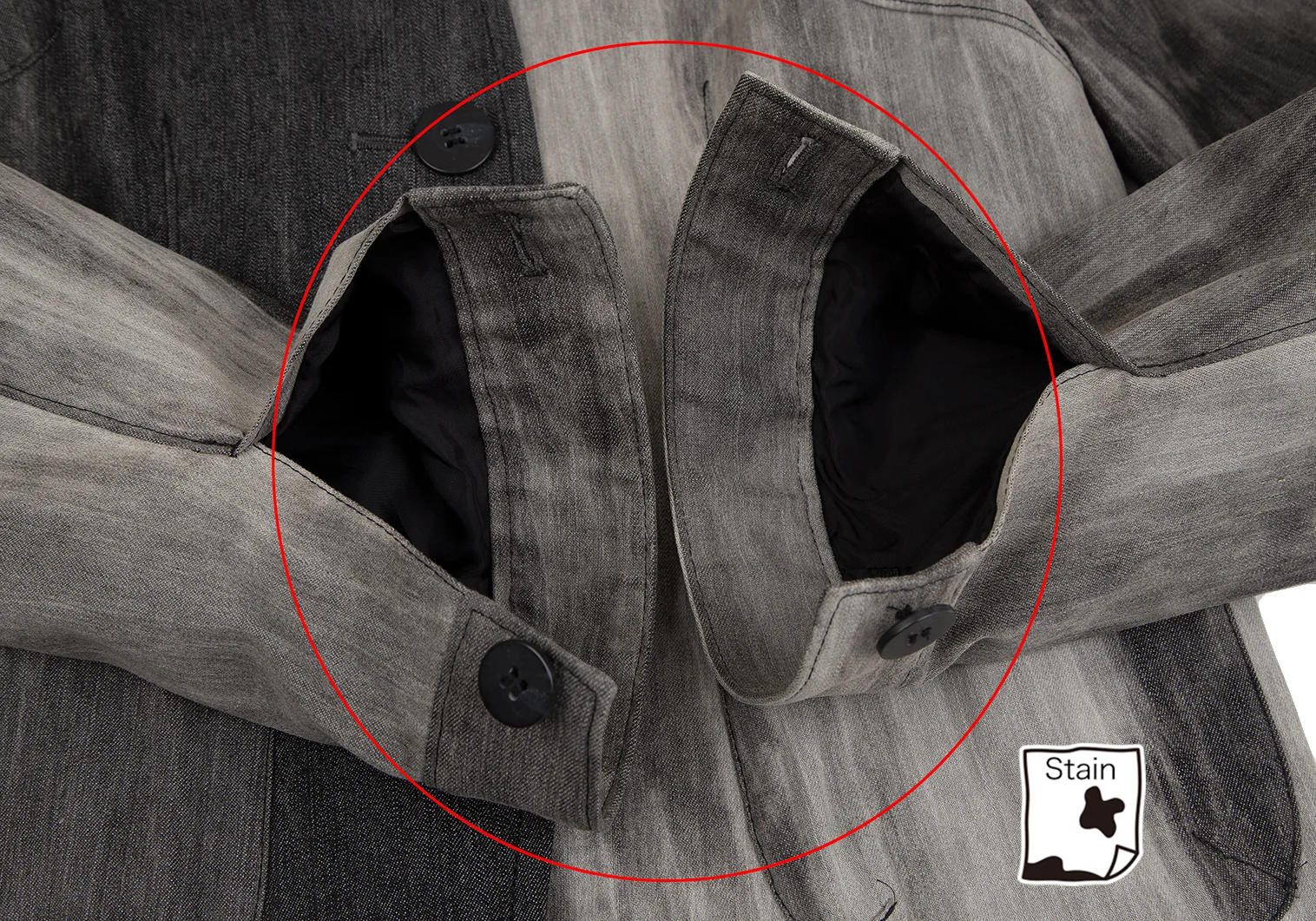 襟裏・袖口に薄汚れ、左袖先にシミ、左肩に汚れがあります(写真参照)。その他目立ったシミ、汚れ、ほつれ等ありません。クリーニング済み