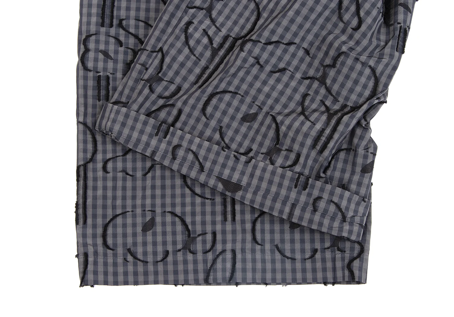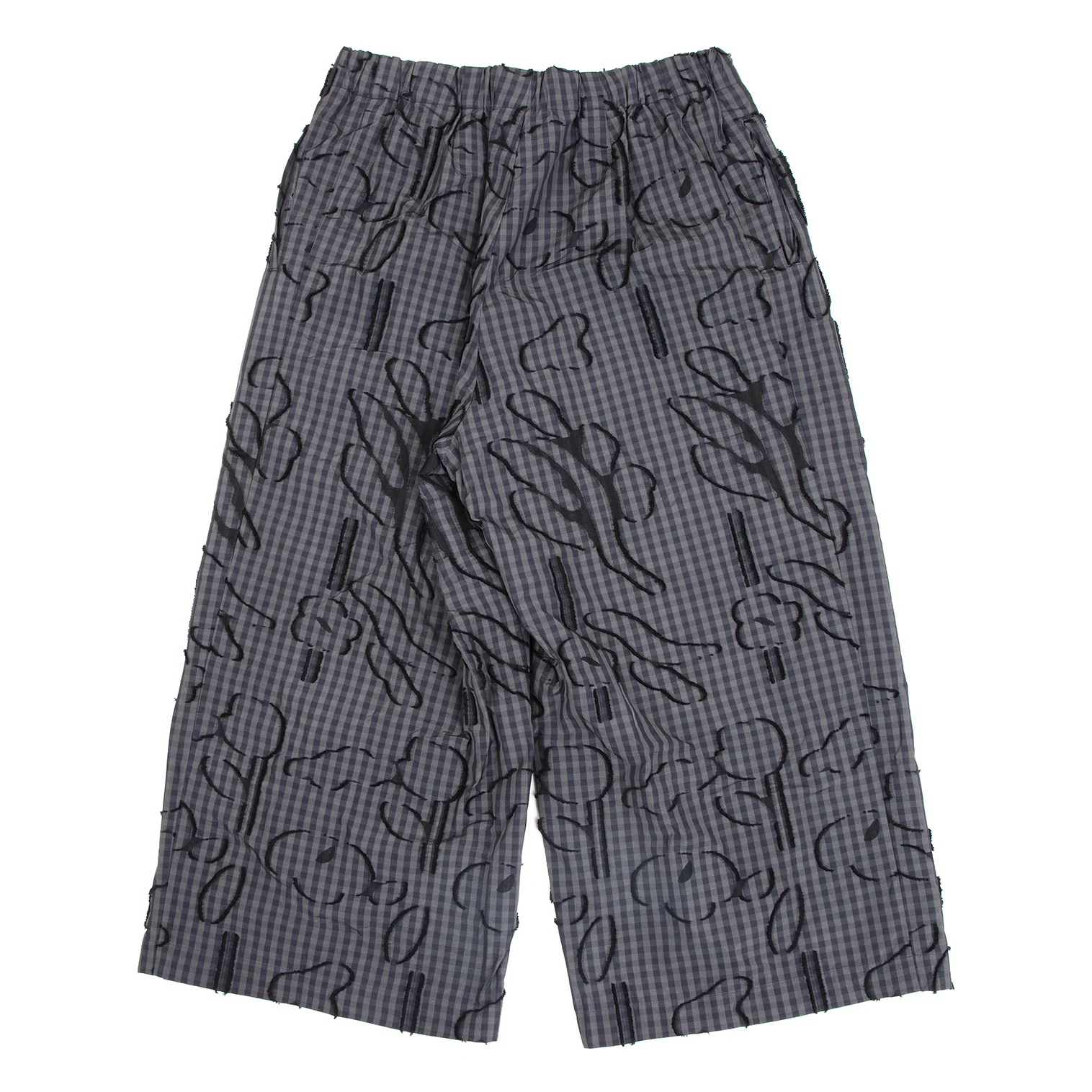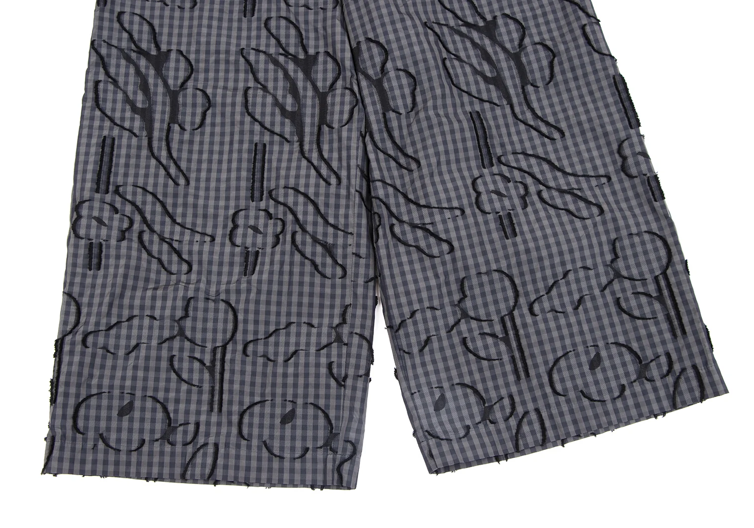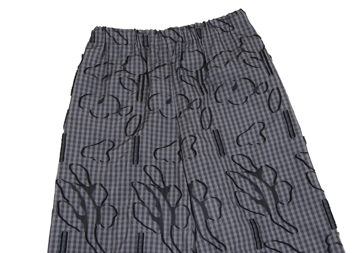 イッセイミヤケ ハートISSEY MIYAKE HaaT コットンポリ総柄フリンジ刺繍ギンガムチェックワイドパンツ カーキ紺黒2