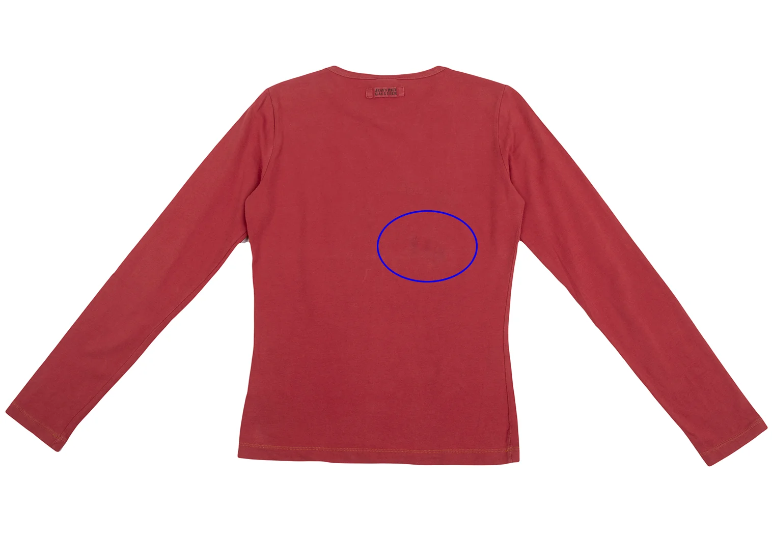 襟ぐりに色褪せ、フロッキーに剥がれ、後ろ身頃に薄汚れがあります(写真参照)その他目立ったシミ、汚れ、ほつれ等なくいい状態です。クリーニング済み