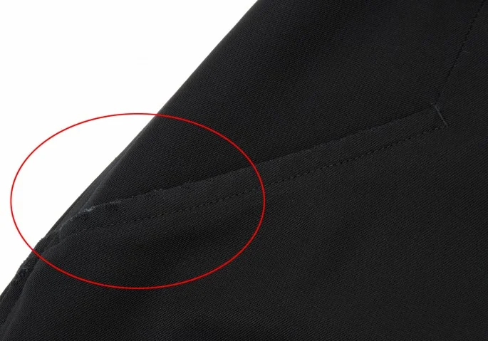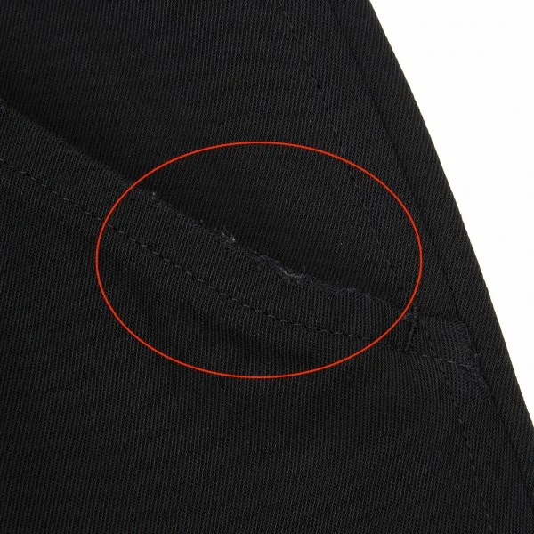 ポケット淵にスレ、裾に補修跡があります(写真参照)。生地に若干テカリがあります。品質タグの文字が消えています。