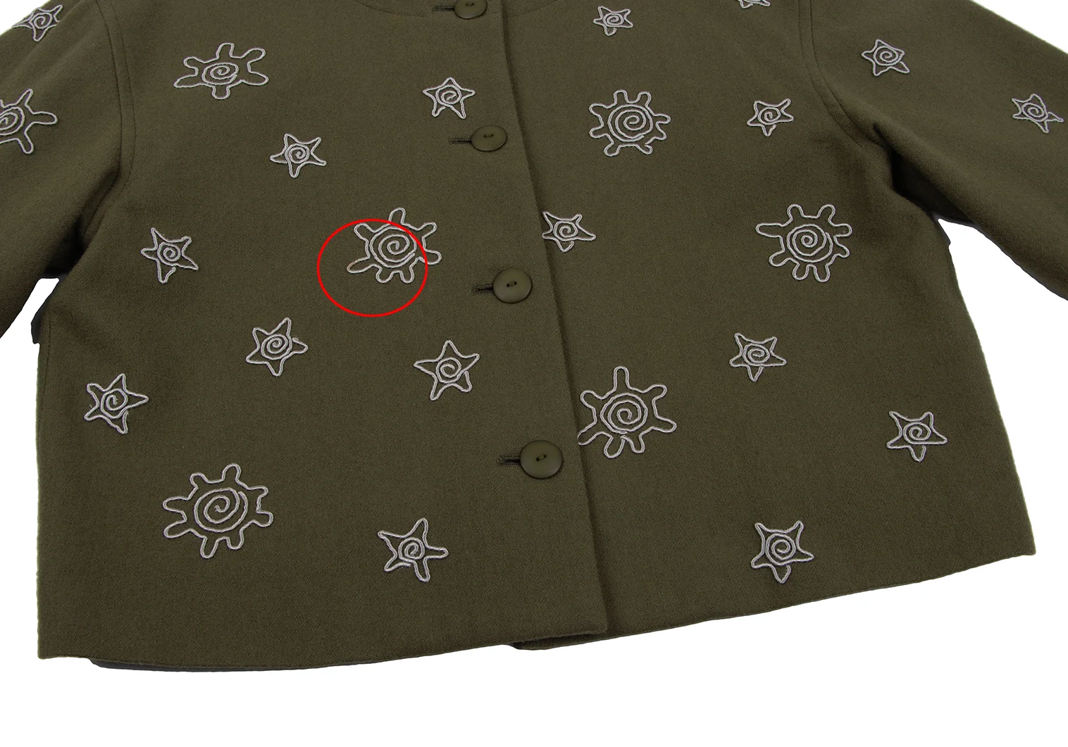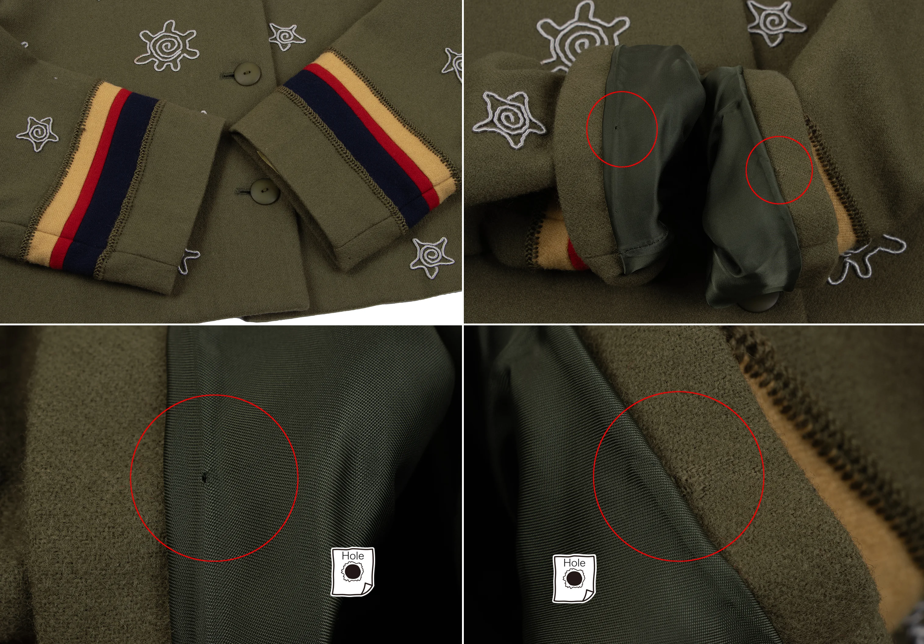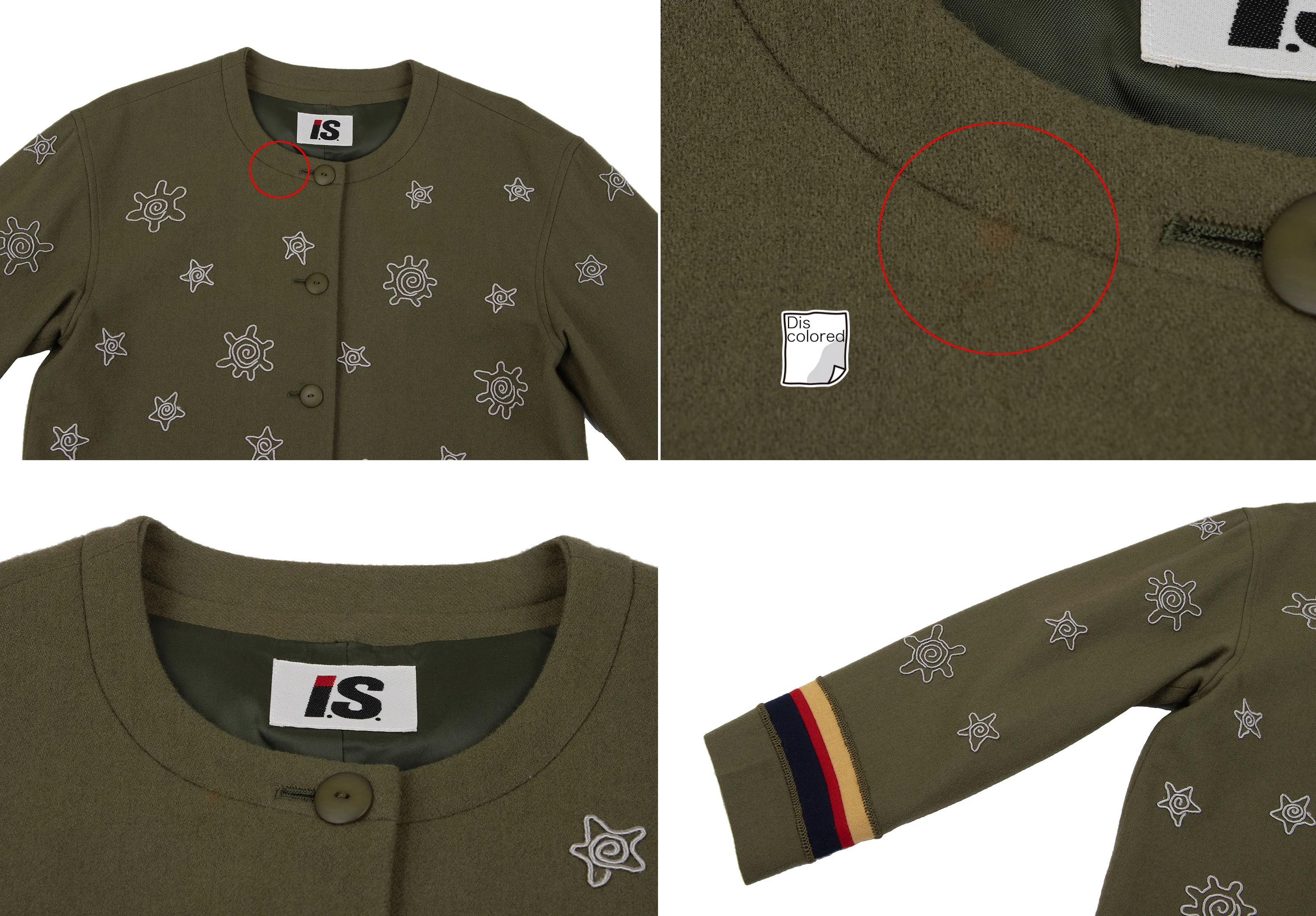 ジャケット:首元・前刺繍部分に変色、袖裏に穴があります(写真参照)。 スカート:前に変色があります(写真参照)。 その他目立ったシミ、汚れ、ほつれ等なくいい状態です。クリーニング済み。