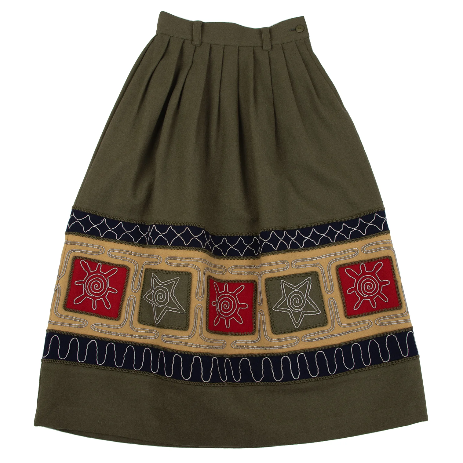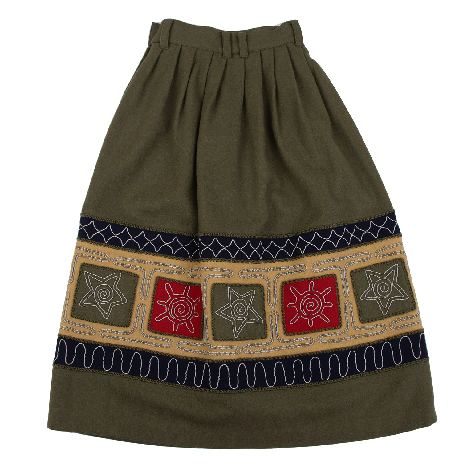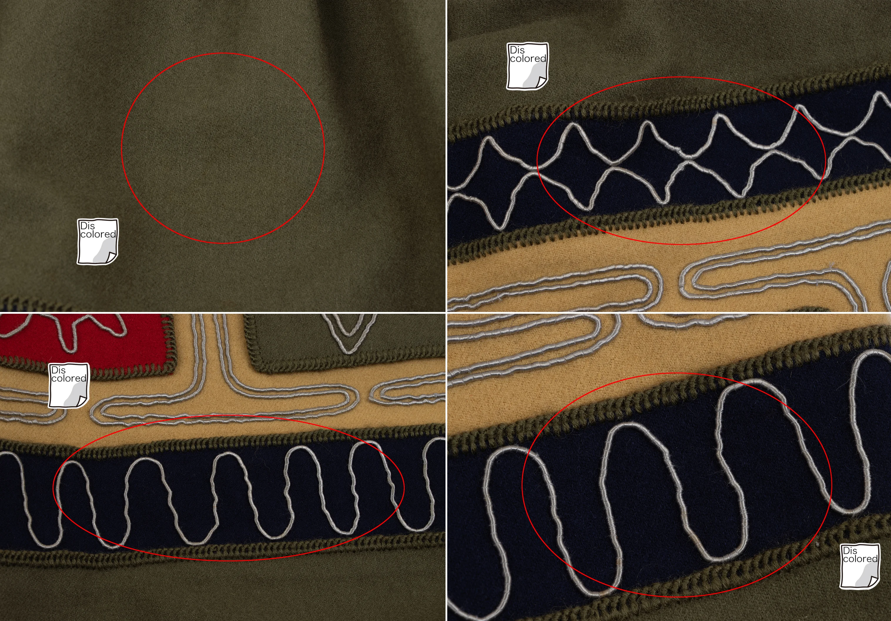 ジャケット:首元・前刺繍部分に変色、袖裏に穴があります(写真参照)。 スカート:前に変色があります(写真参照)。 その他目立ったシミ、汚れ、ほつれ等なくいい状態です。クリーニング済み。