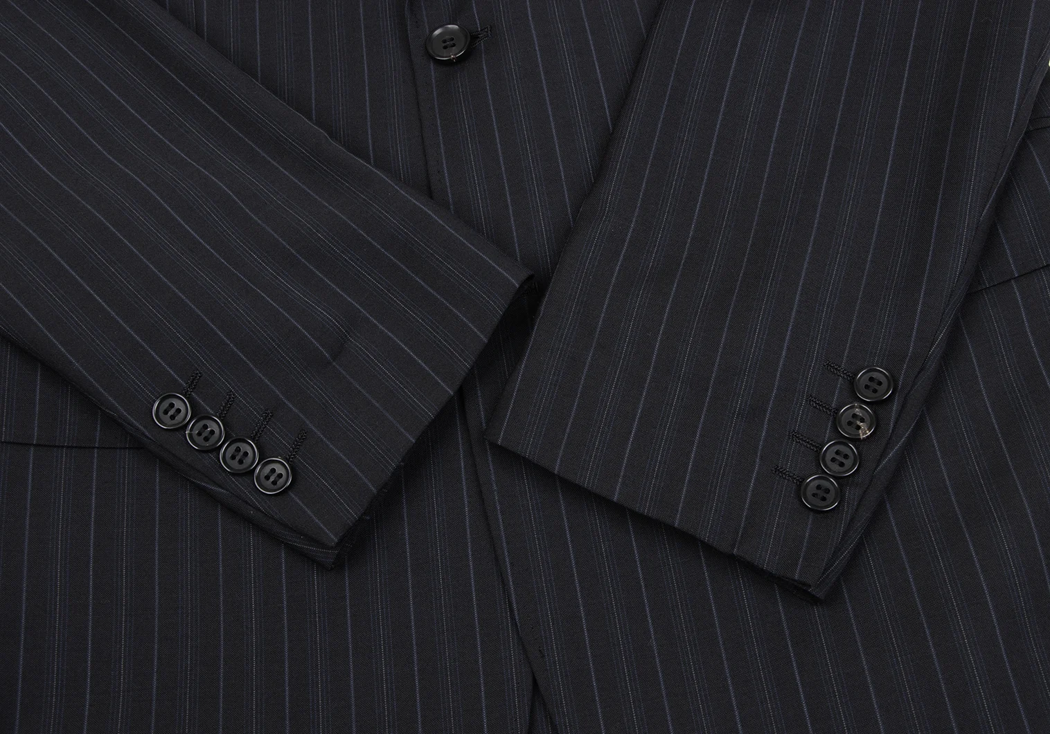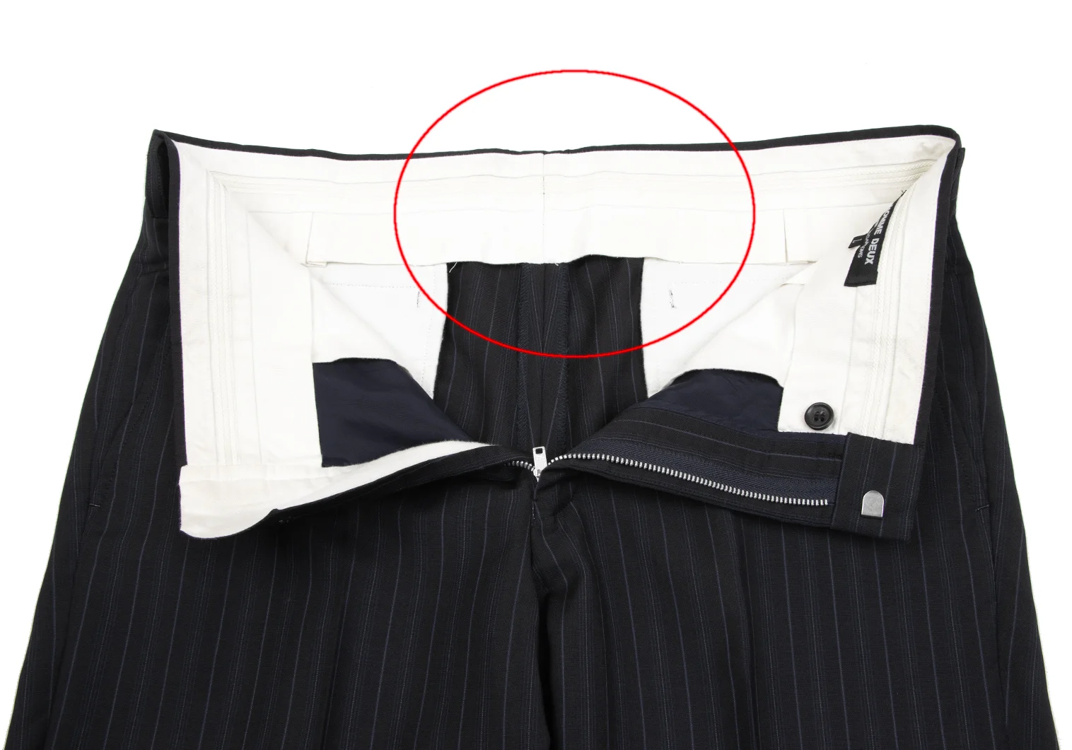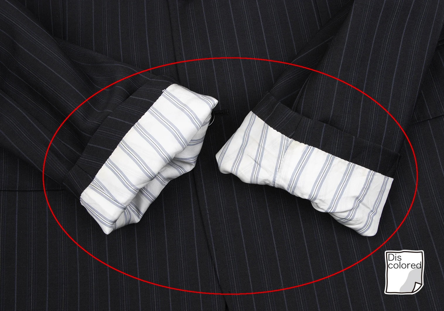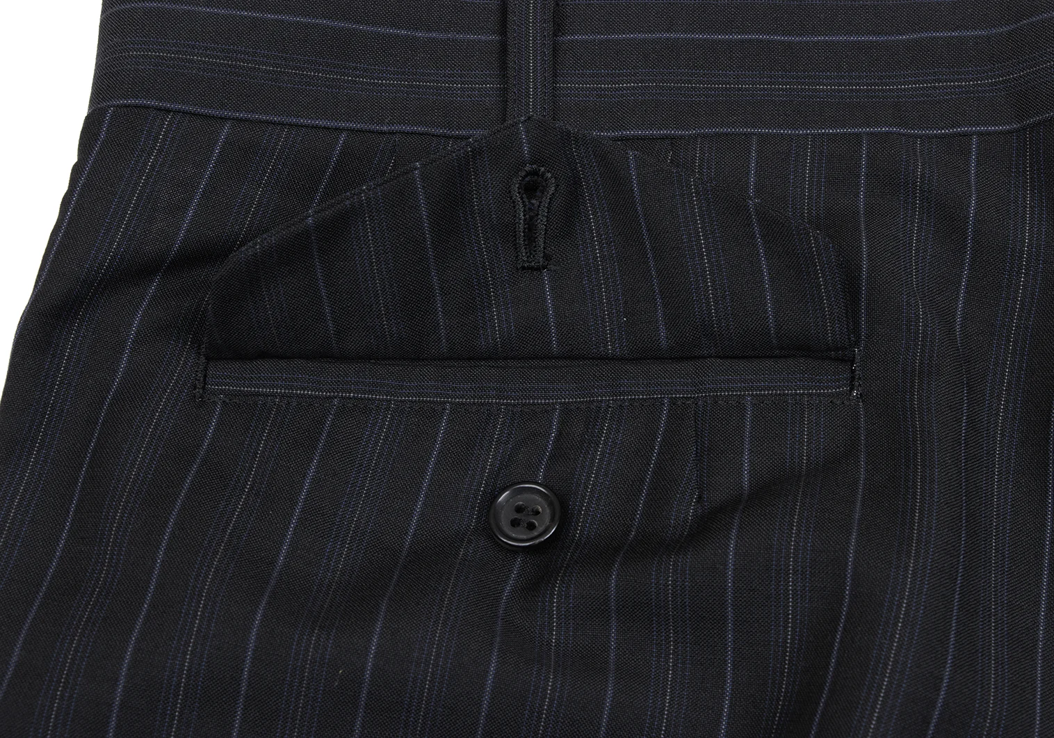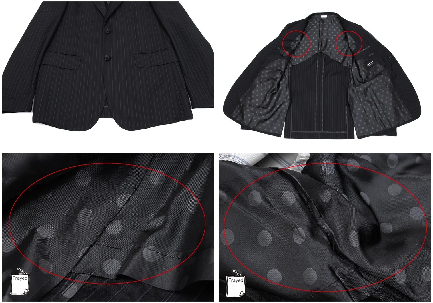 ジャケット:袖裏地に変色、脇下裏地に縫製ほつれがあります。パンツ:ウエスト見返しに薄汚れがあります。(写真参照)その他目立ったシミ、汚れ、ほつれ等なくいい状態です。クリーニング済み。