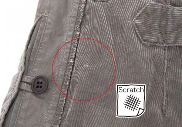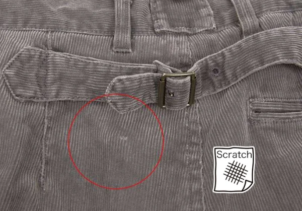 左足前裾に薄シミあり。後ろヒップ上辺りに生地ダメージあり(写真参照)。その他は目立った汚れ、ほつれ等なくいい状態です。クリーニング済み