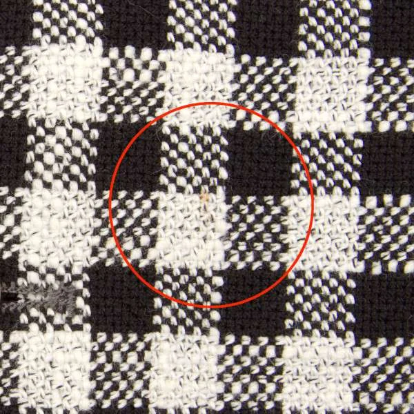 サイドに日焼けあり。前身頃左裾にシミあり(写真参照)。その他ほつれ等はありません。