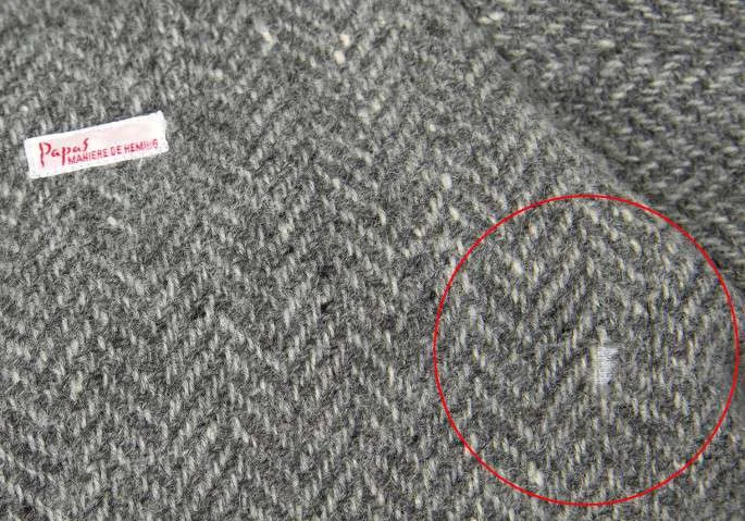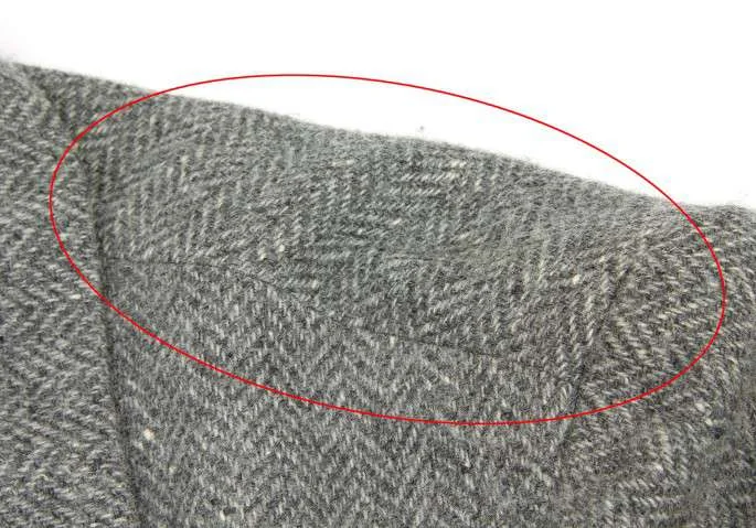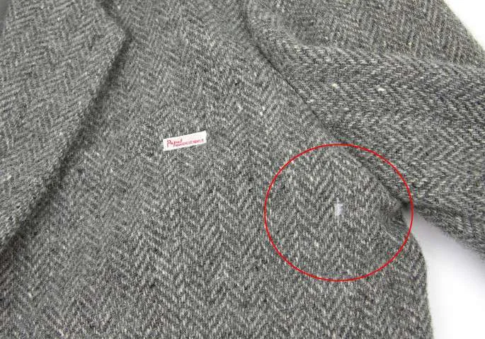 襟裏、袖口裏に汚れあり。肩、前身頃裾に日焼け、左脇に生地ダメージあり。