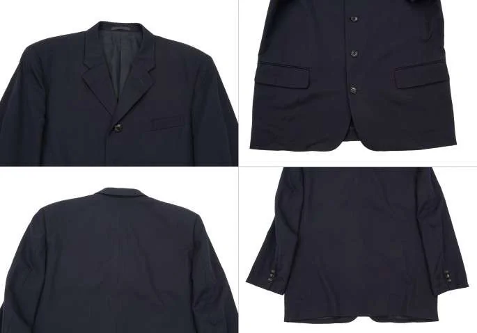 ジャケットの襟裏に薄汚れ、左袖先に擦れ傷あり。その他に生地テカりがありますが、目立ったシミ、汚れ、ほつれ等なくいい状態です。クリーニング済み