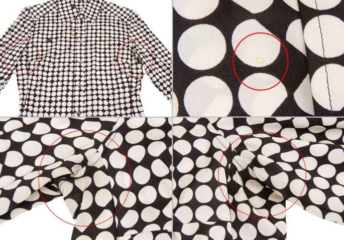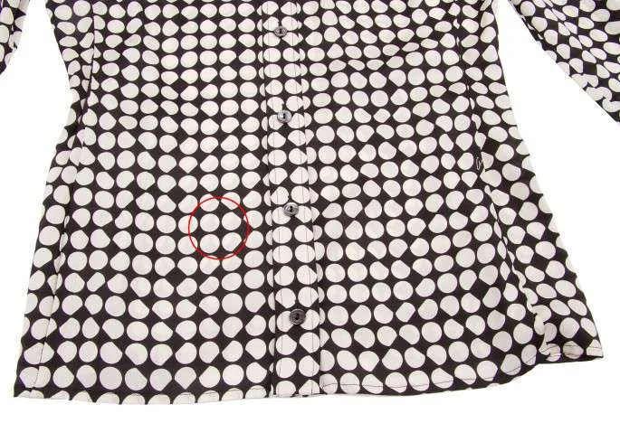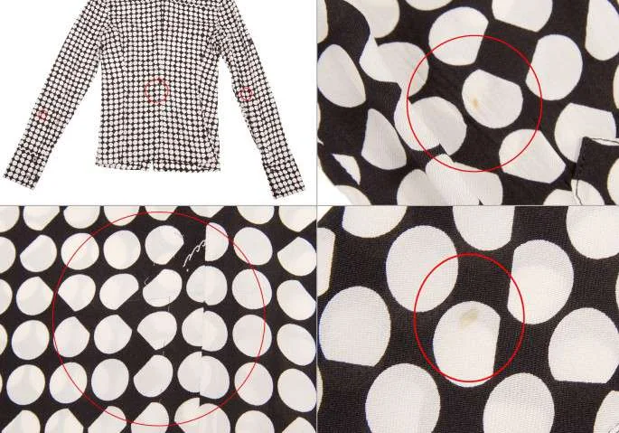 身頃、袖に点シミあり。両脇にシミあり。後身頃に糸引きあり(写真参照)。クリーニング済み