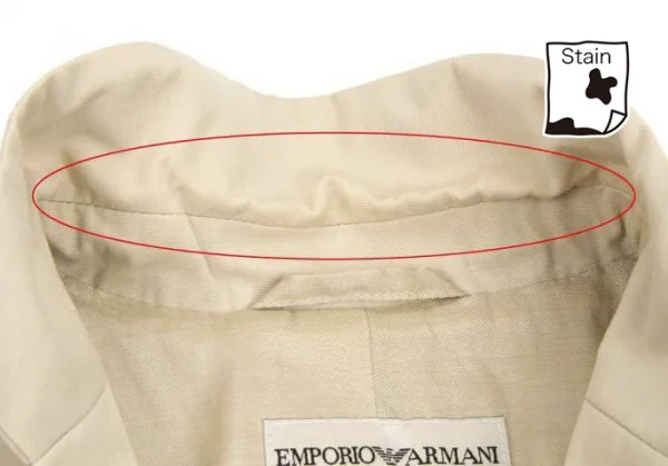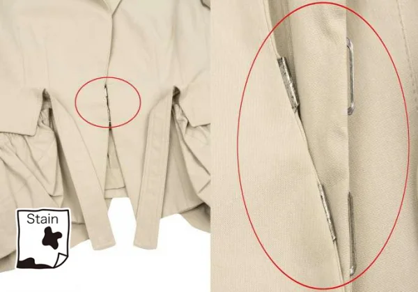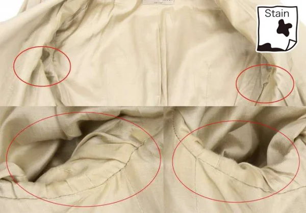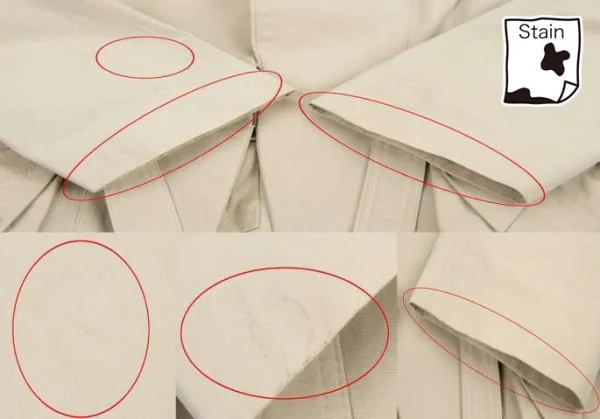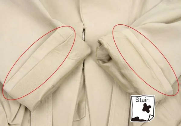 襟裏、袖口裏に変色あり。裏側両脇にシミあり。身頃、袖に薄シミあり。前金具に変色あり(写真参照)。クリーニング済み
