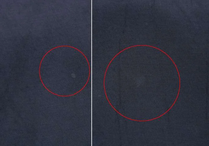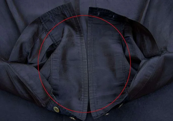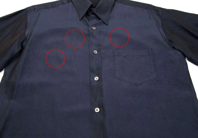 襟裏に汚れあり。前身頃に薄シミ多数あり。袖口角に擦れ、袖口裏に着用跡あり(写真参照)。クリーニング済み