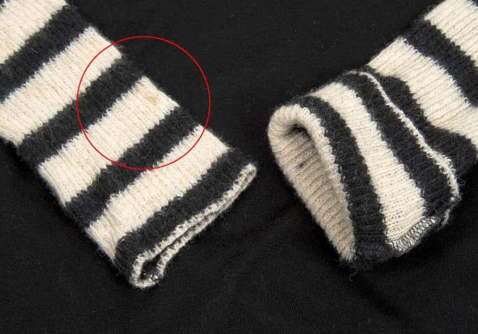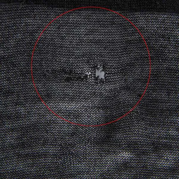 後身頃に穴あり。右袖口にシミあり(写真参照)。
