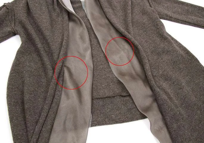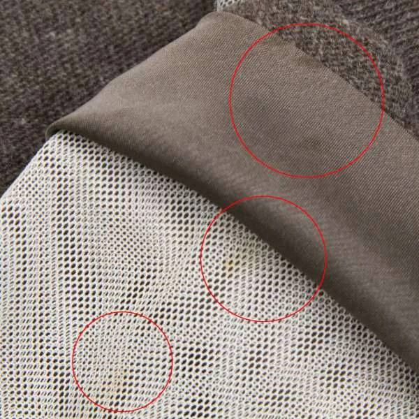 別布部分に引っ掛け、左袖口にシミがあります(画像参照)。その他は目立ったシミ、汚れ、ほつれ等なくいい状態です。クリーニング済み
