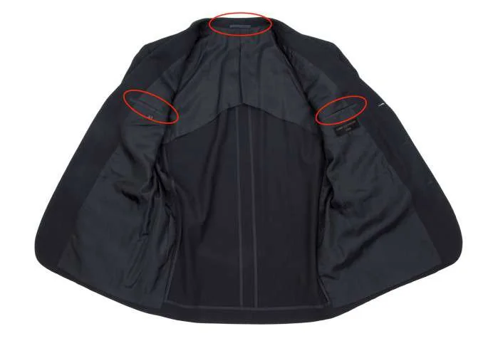 襟裏、襟元に薄汚れ、内ポケット口に擦れあり。後ろ袖に擦れテカリあり(写真参照)。その他に目立ったシミ、汚れ、ほつれ等はありません。