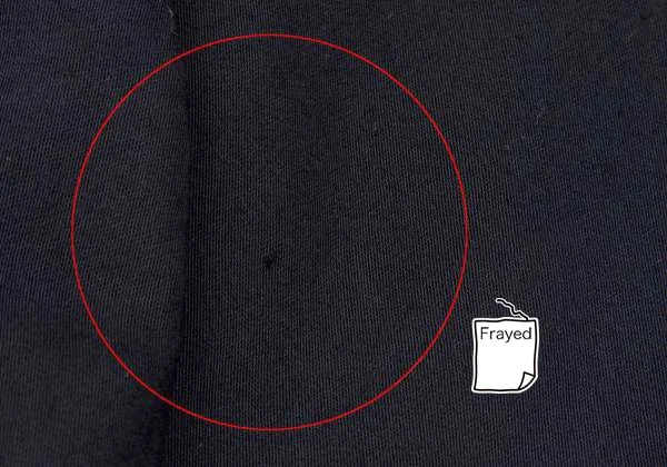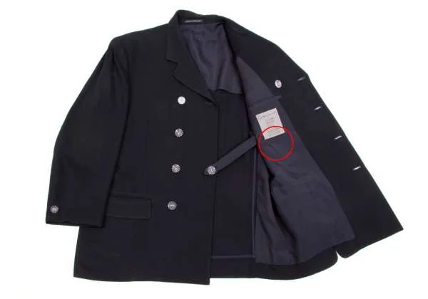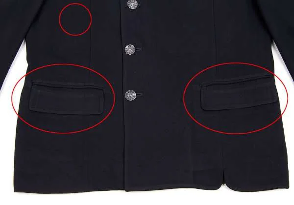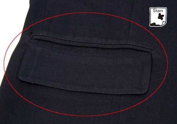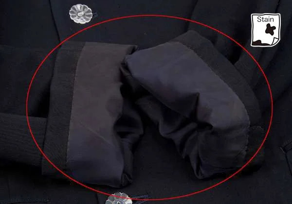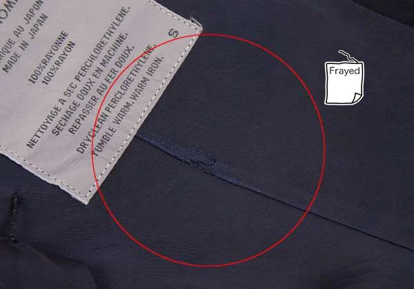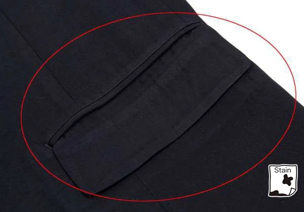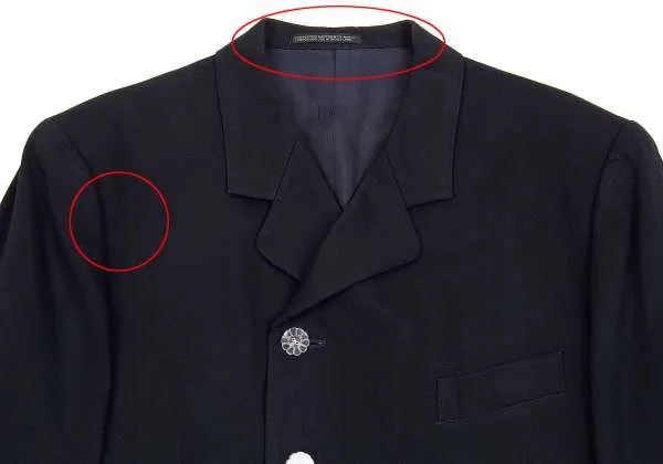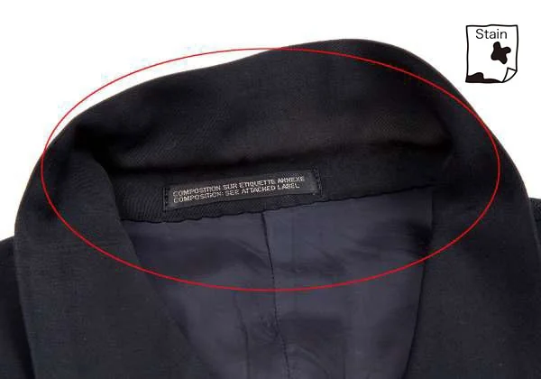 襟裏、袖裏に変色あり。前身頃に引っ掛け、ポケットに生地テカリあり。裏に擦れあり。(写真参照)