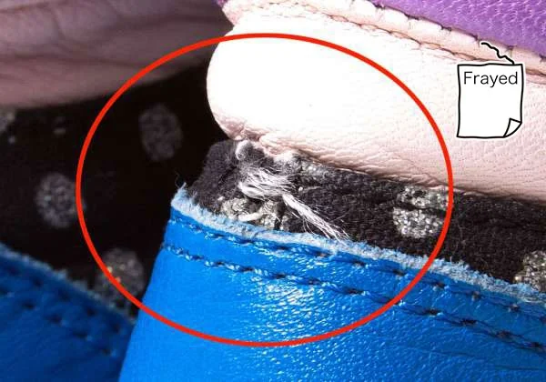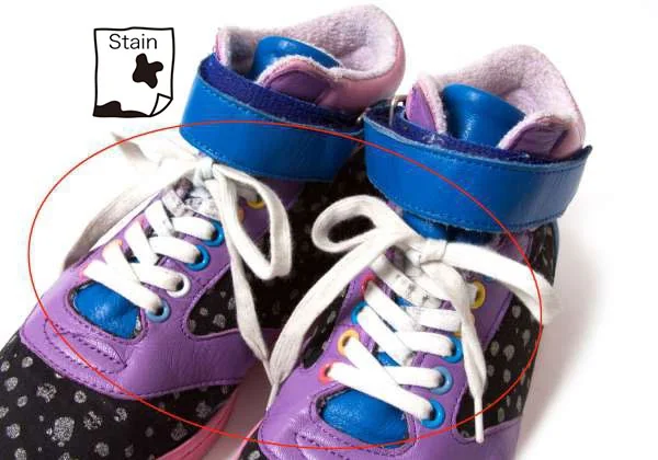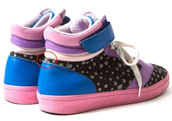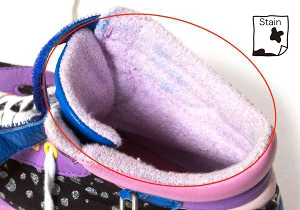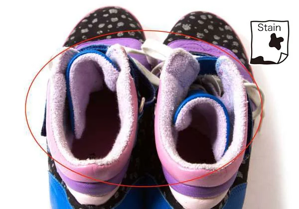 ソール全体に薄汚れ、内側に色移り、踵にダメージ、靴紐に汚れがあります(写真参照)