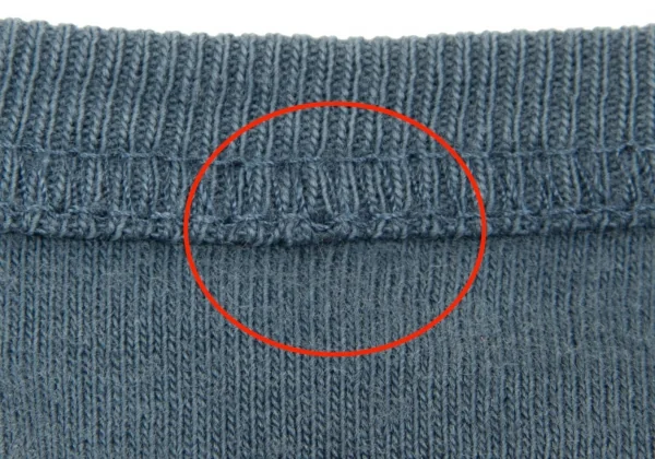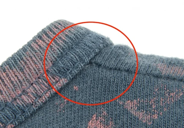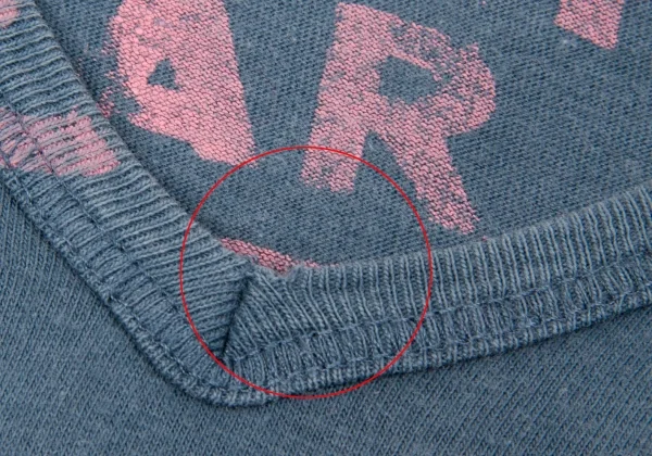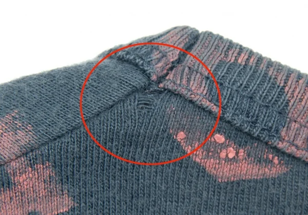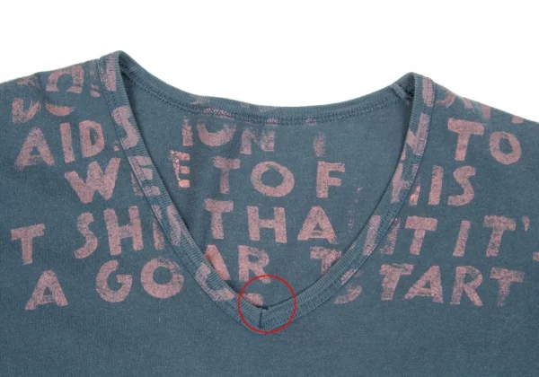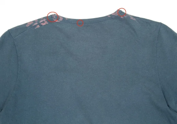品質タグが消えています。襟元部分に生地のダメージ、全体的に毛羽立ち・色褪せがあります(画像参照)。