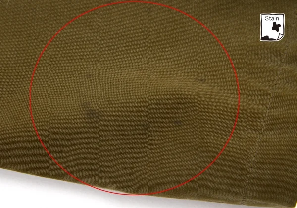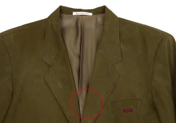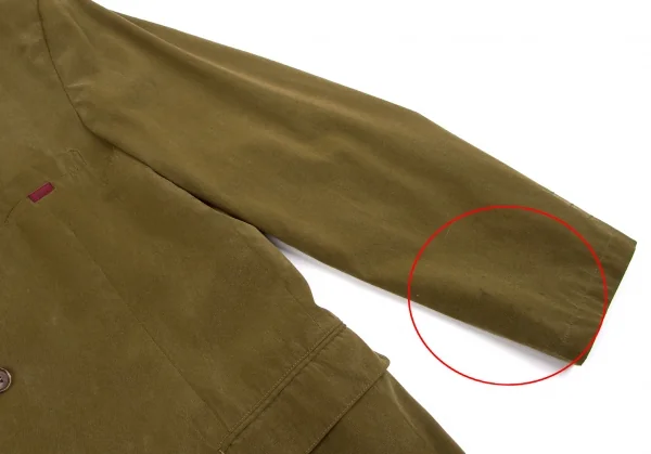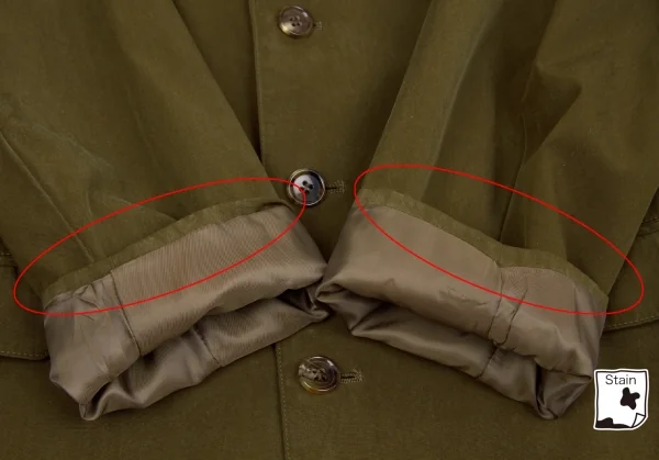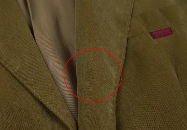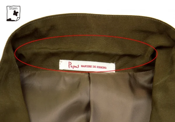 襟元、袖裏に汚れが有ります。ラペル部、左袖にシミが有ります(写真参照)クリーニング済み。