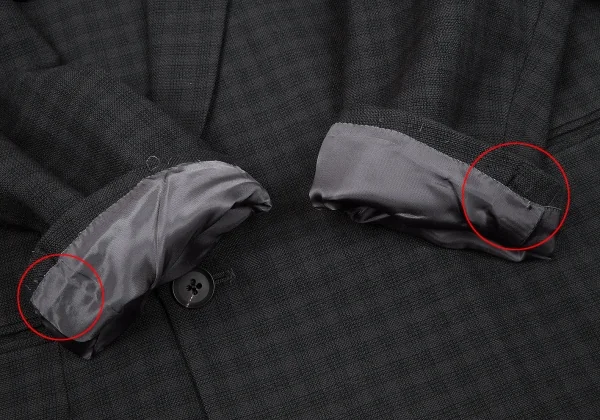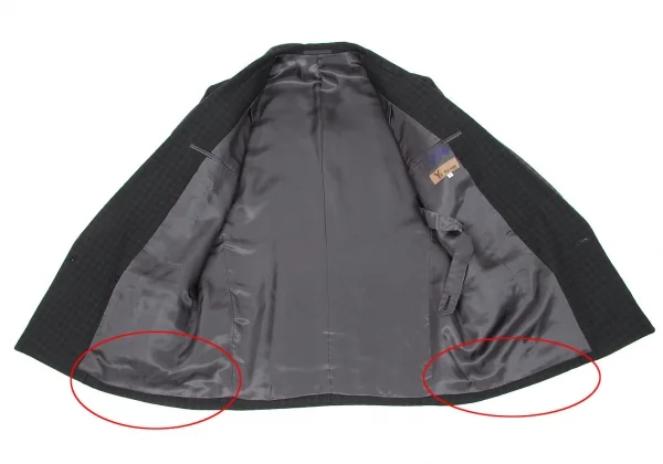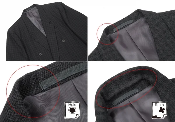 ジャケット 襟裏に汚れ、裏地裾に変色あり。襟、袖裏に小穴あり。ネーム刺繍あり。(写真参照)その他に目立ったシミ、汚れ、ほつれ等なくいい状態です。クリーニング済み