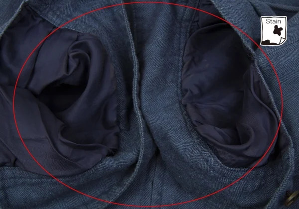 襟裏にシミ、袖裏に汚れ、前後身頃にスレがあります(画像参照)。その他目立ったシミ、汚れ、ほつれ等なくいい状態です。クリーニング済み