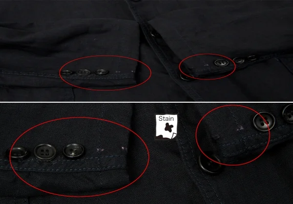 ジャケット:襟裏・袖・袖裏・後身頃に汚れ、袖裏に丈の詰め跡があります(画像参照)。その他目立ったシミ、汚れ、ほつれ等なくいい状態です。クリーニング済み