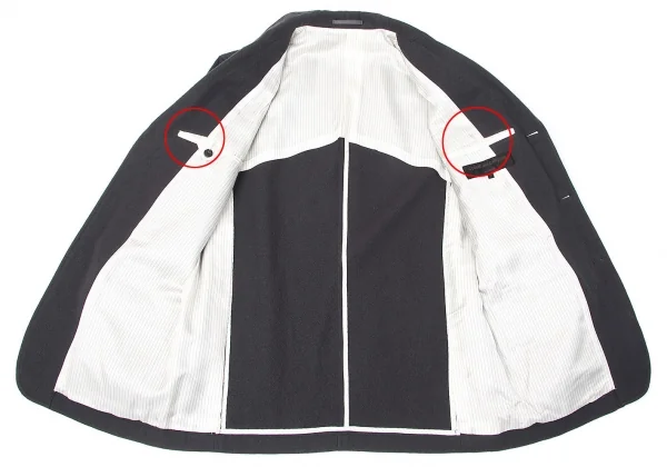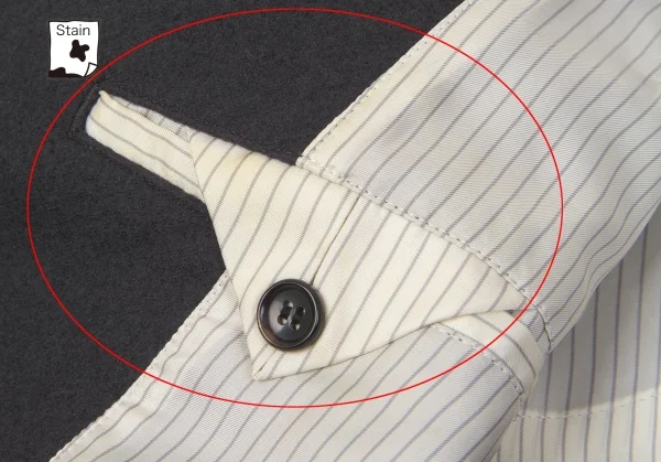 襟裏に擦れ、裏地ポケットにシミあり(写真参照)。その他に目立ったシミ、汚れ、ほつれ等なくいい状態です。クリーニング済み