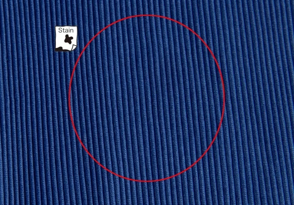 こちらの商品の生地には少し透け感があります。前身頃に薄シミがあります(画像参照)。その他目立ったシミ、汚れ、ほつれ等なくいい状態です。クリーニング済み