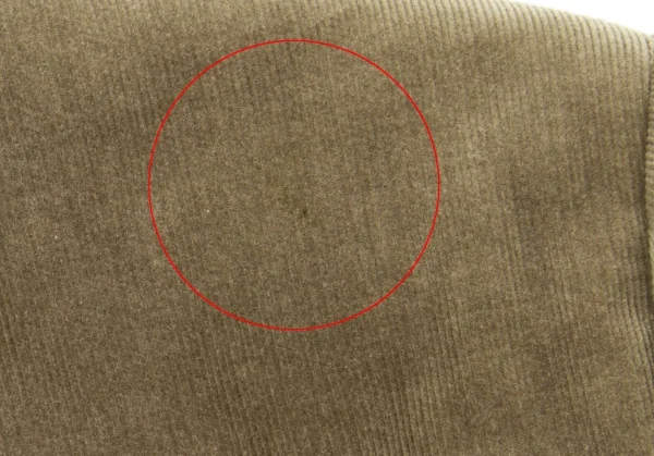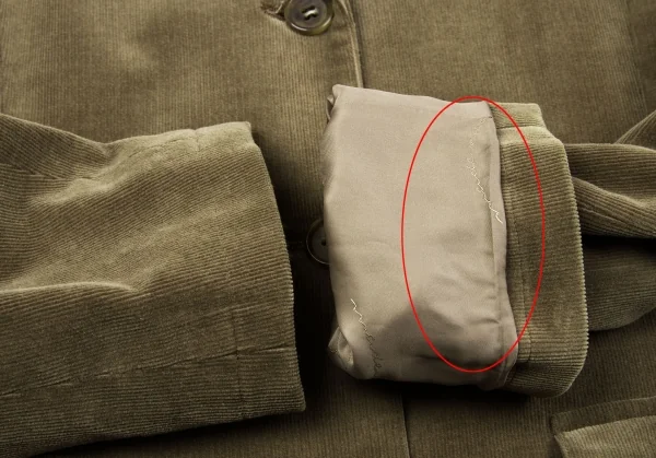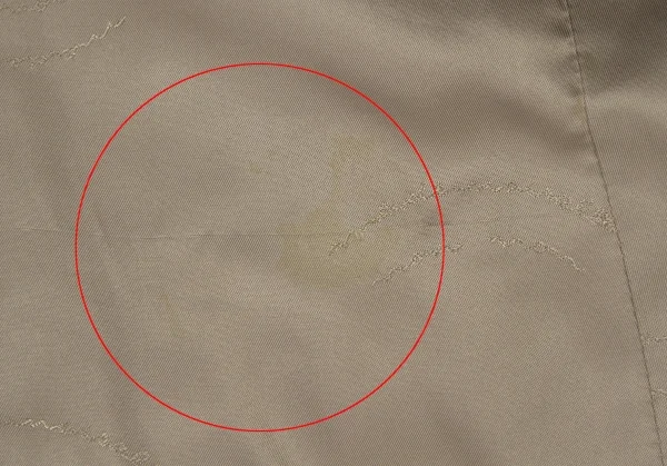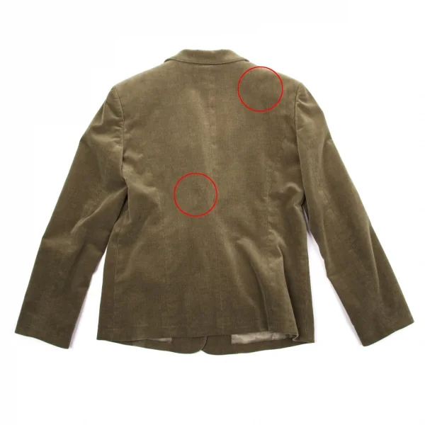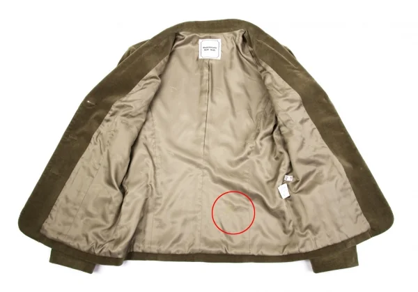 襟裏に汚れ、左袖裏に薄汚れあり。右肩、裏地にシミあり。後身頃に擦れあり。(写真参照)その他に目立ったシミ、汚れ、ほつれ等なくいい状態です。クリーニング済み